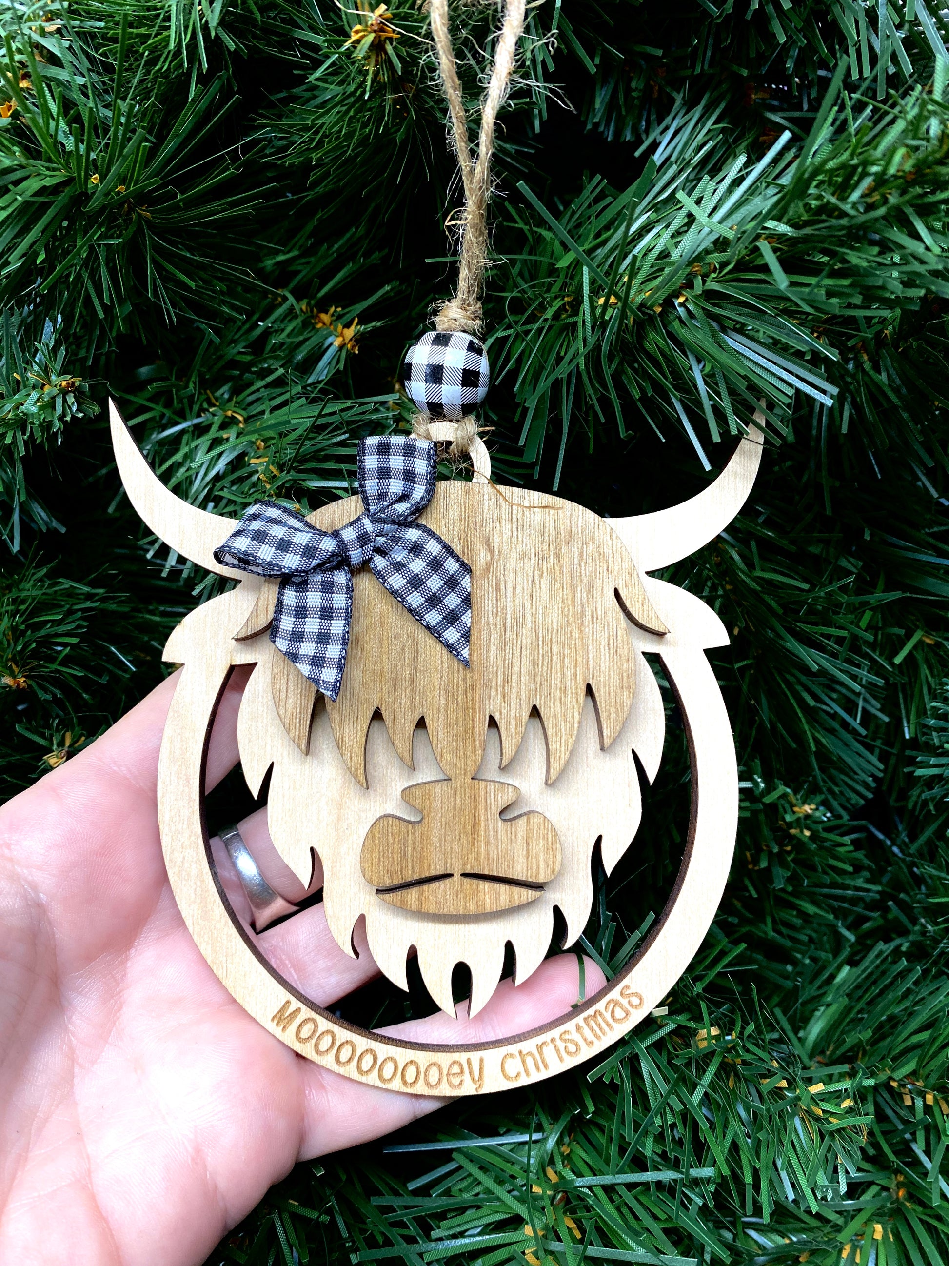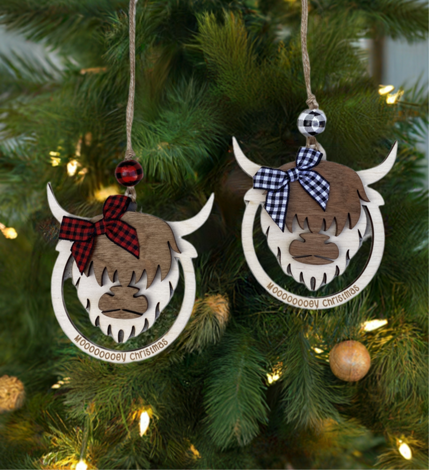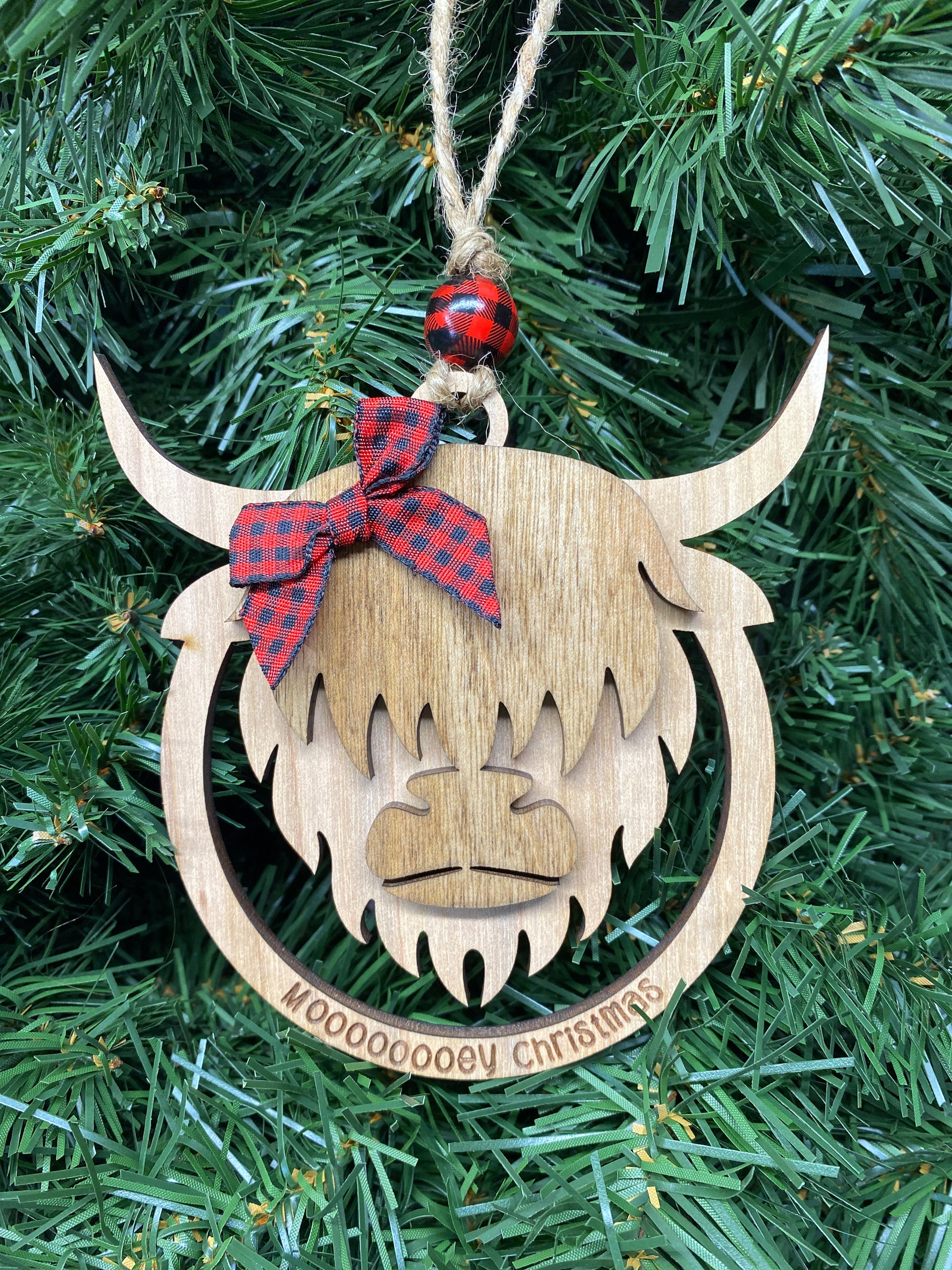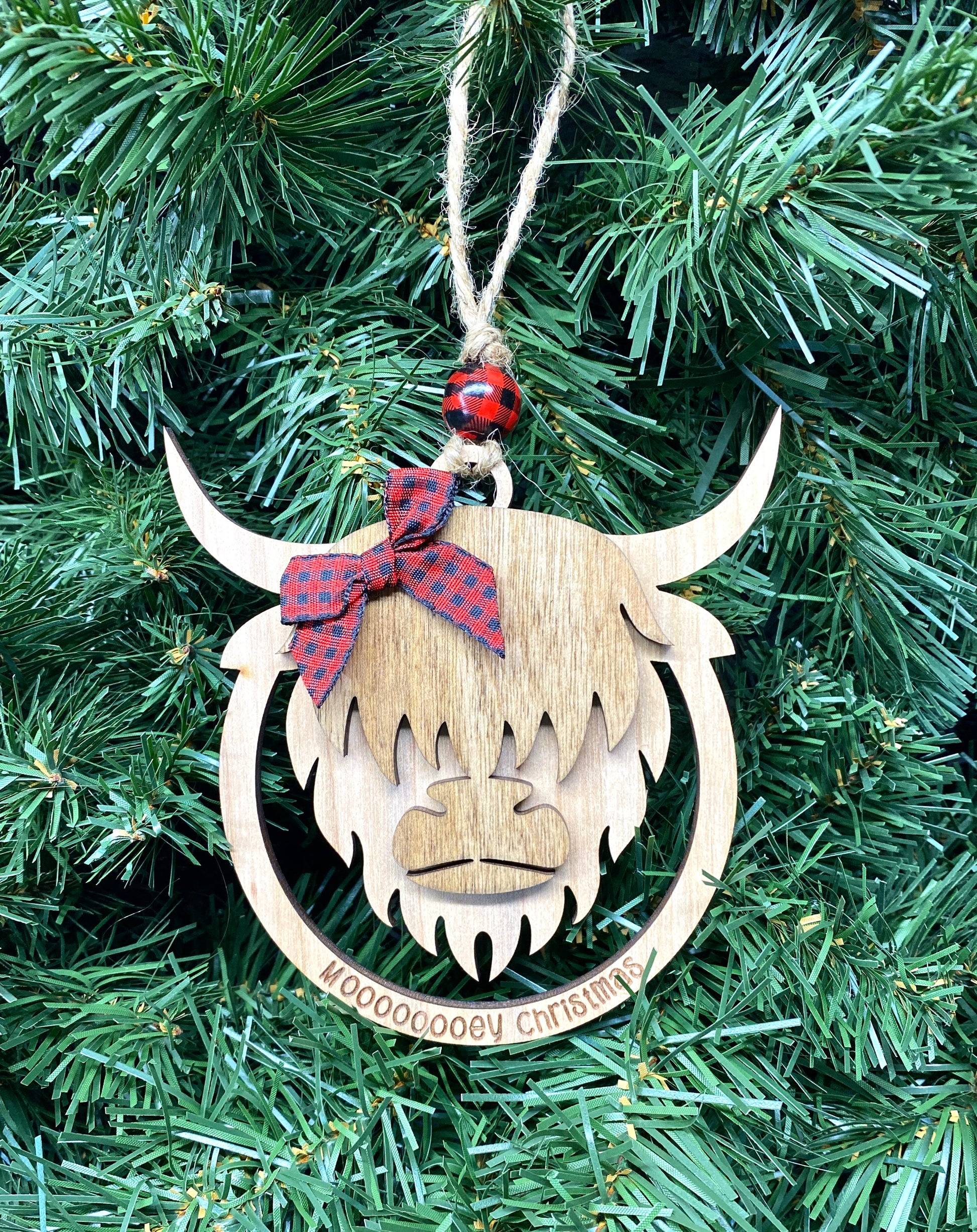 Delight in the Christmas spirit with this Highland Cow Mooooooooey ornament! Handcrafted and made with the highest quality of wood, this ornament will bring cheer to any room with its engraved, cut and stained design. Adorn your tree with this whimsical ornament to spread holiday cheer!