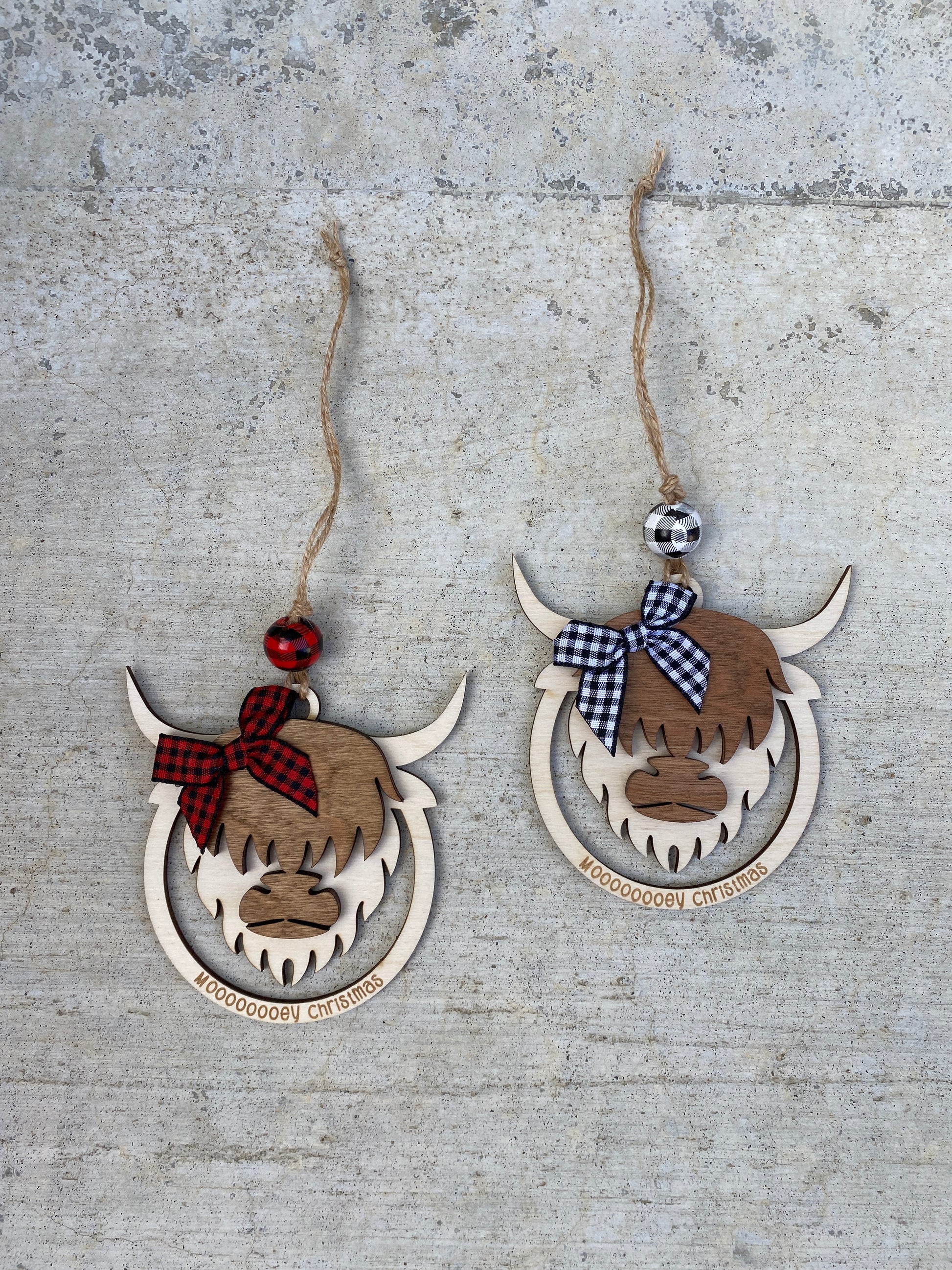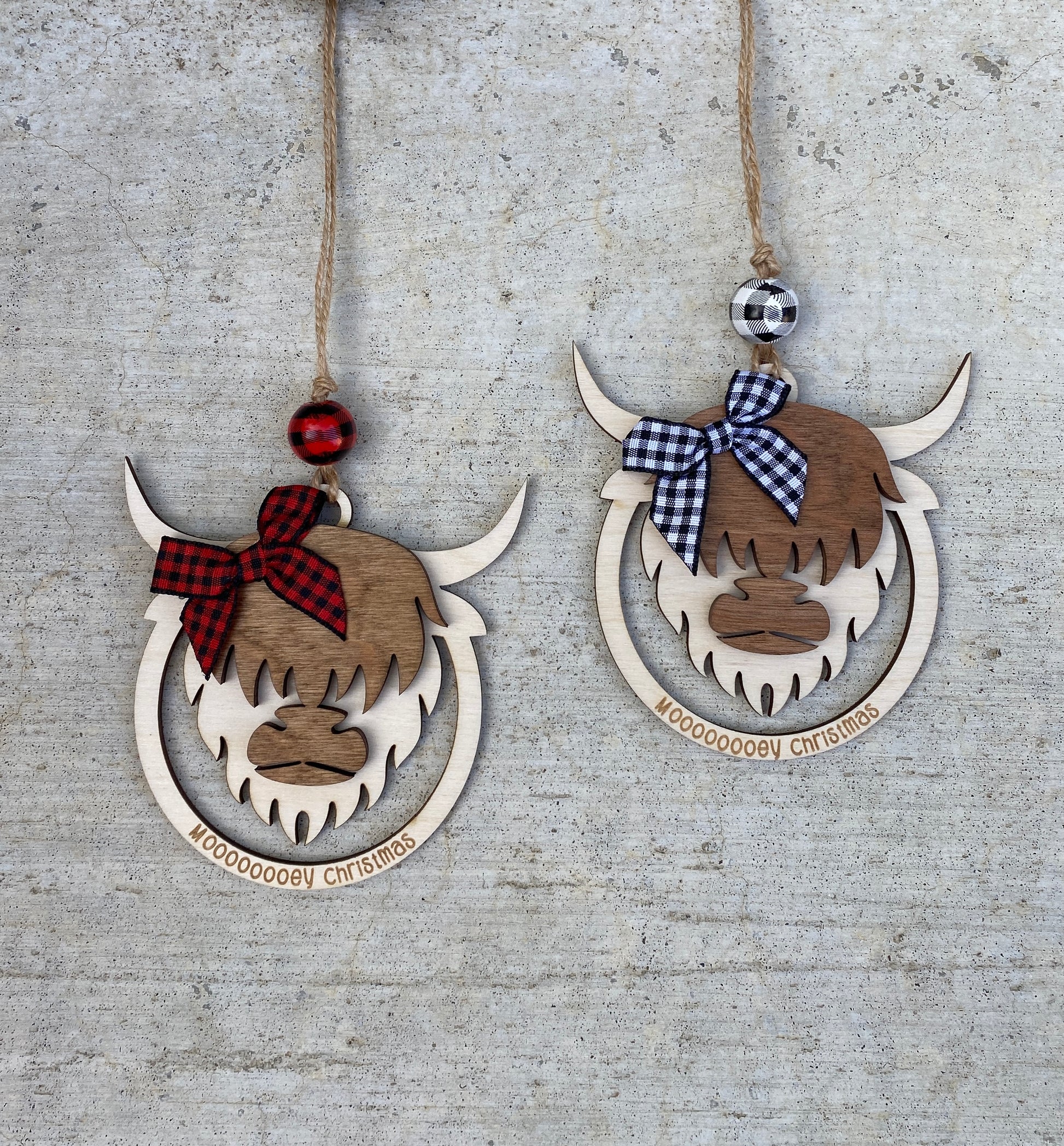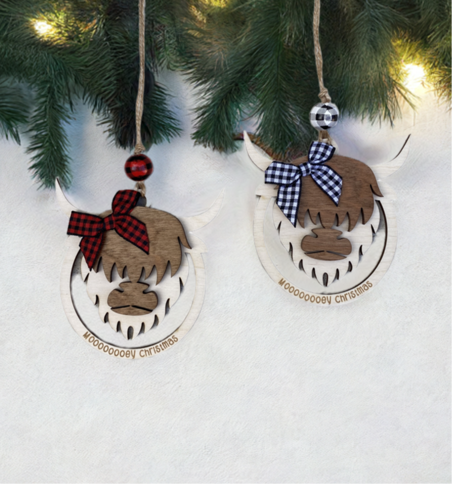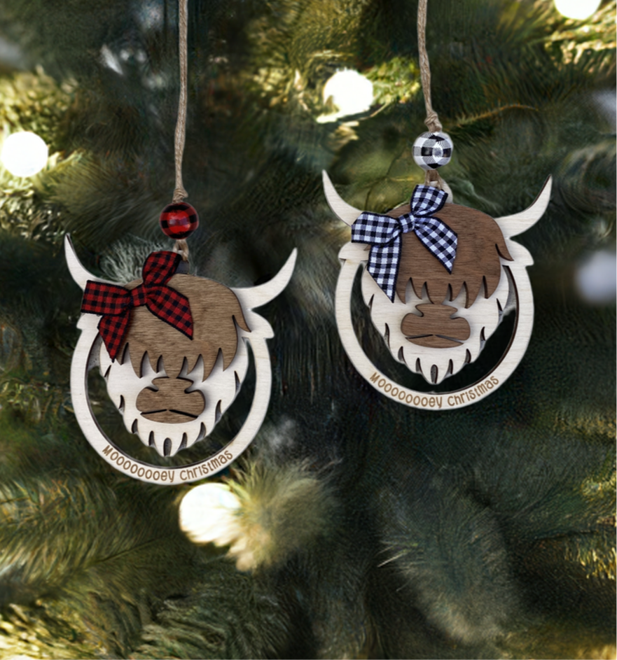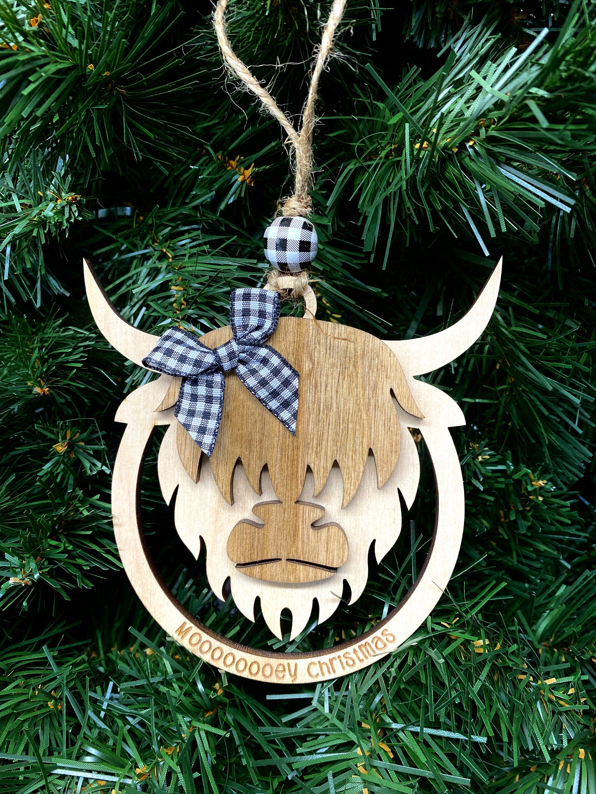 Delight in the Christmas spirit with this Highland Cow Mooooooooey ornament! Handcrafted and made with the highest quality of wood, this ornament will bring cheer to any room with its engraved, cut and stained design. Adorn your tree with this whimsical ornament to spread holiday cheer!