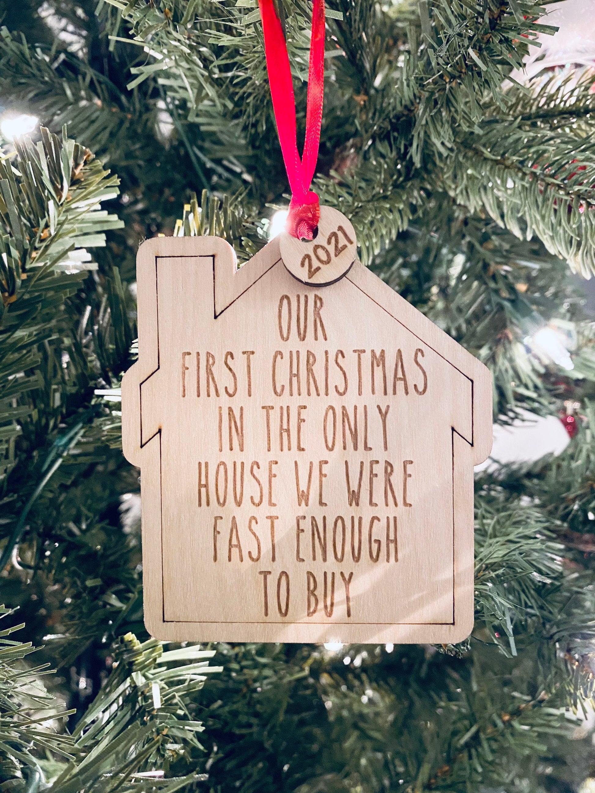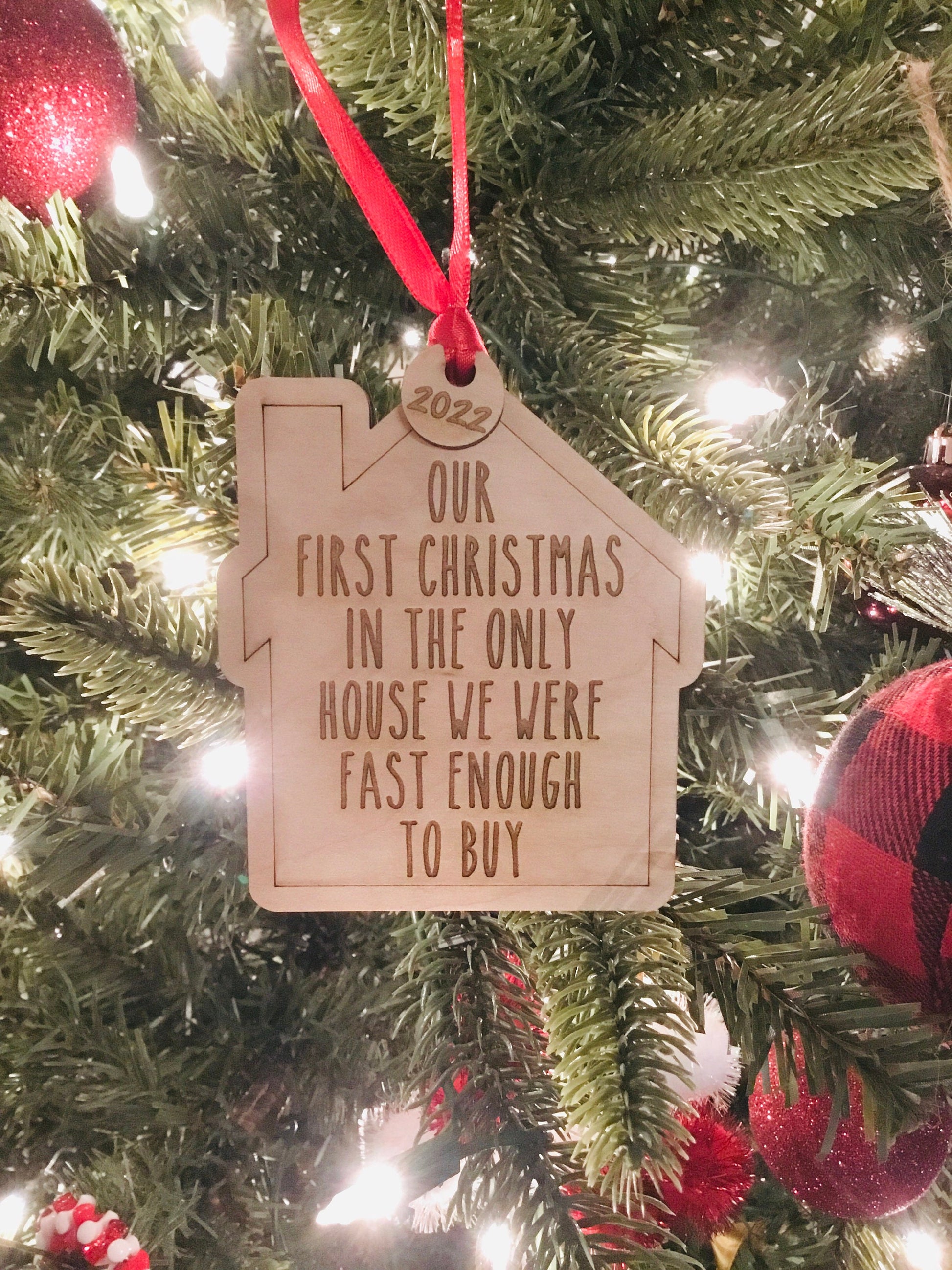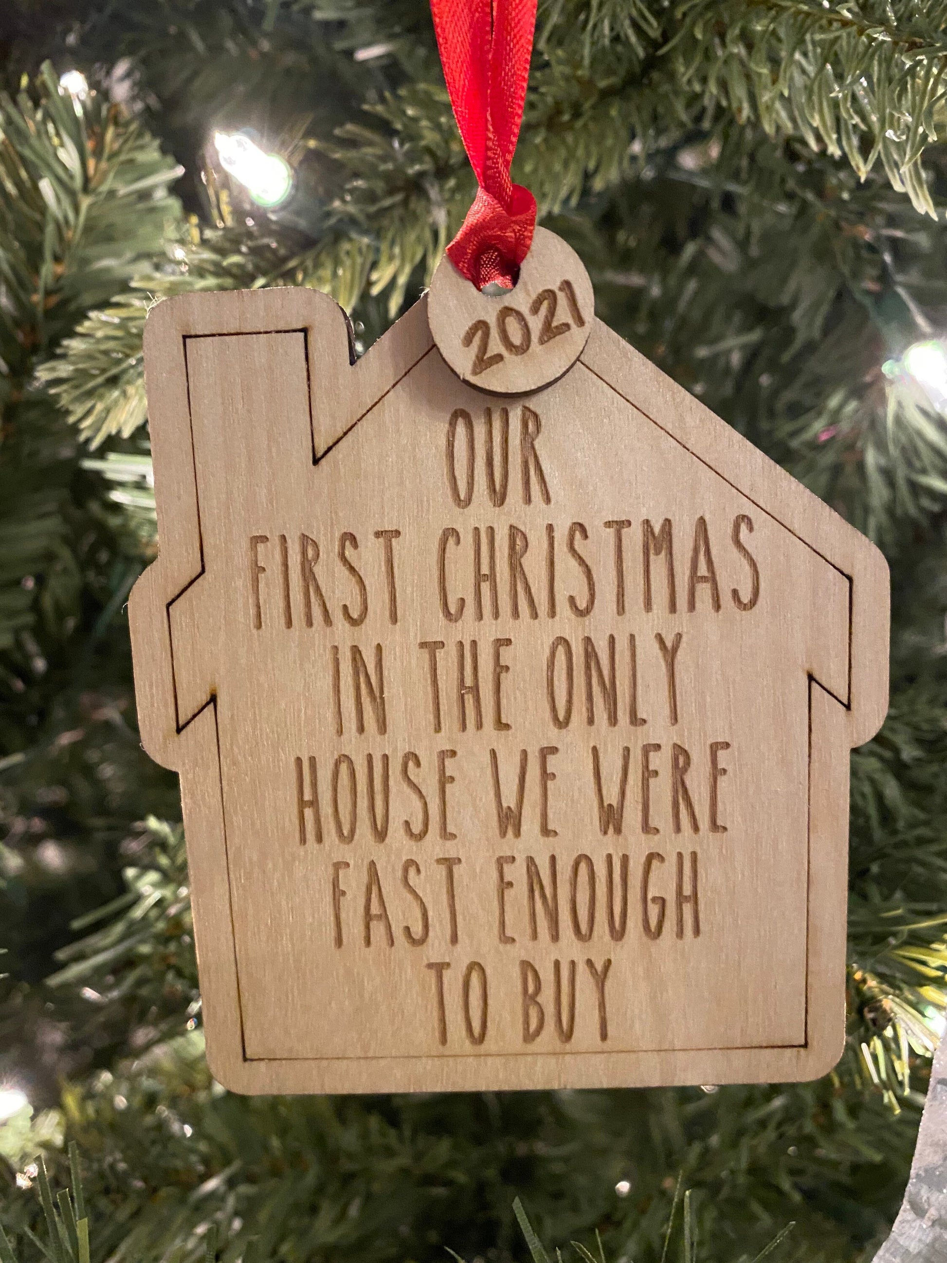 Our first Christmas in our new home is sure to bring a laugh to all that read it. Anyone who has bought a house in the past couple of years can relate! Our ornament is a must have for all new home owners.