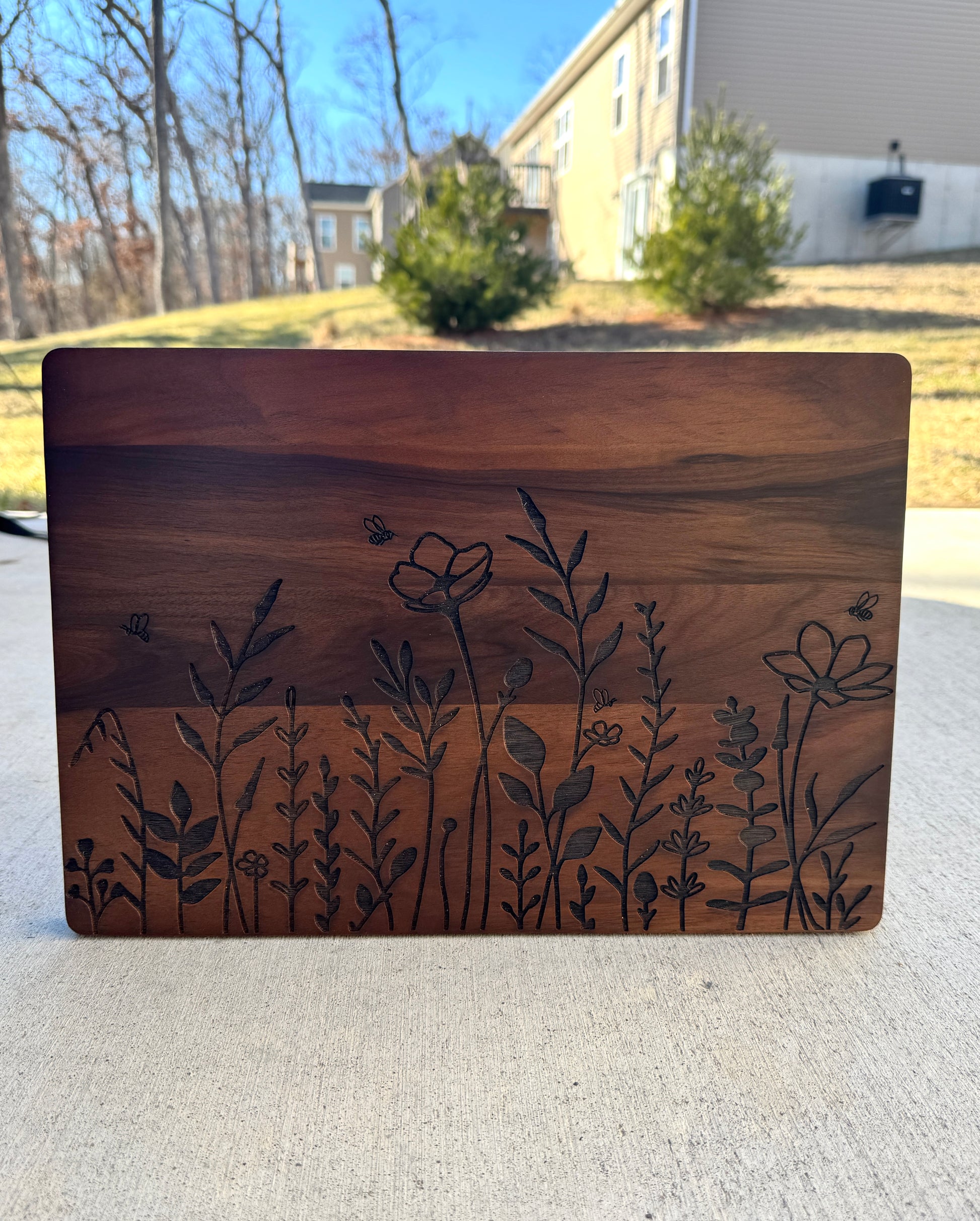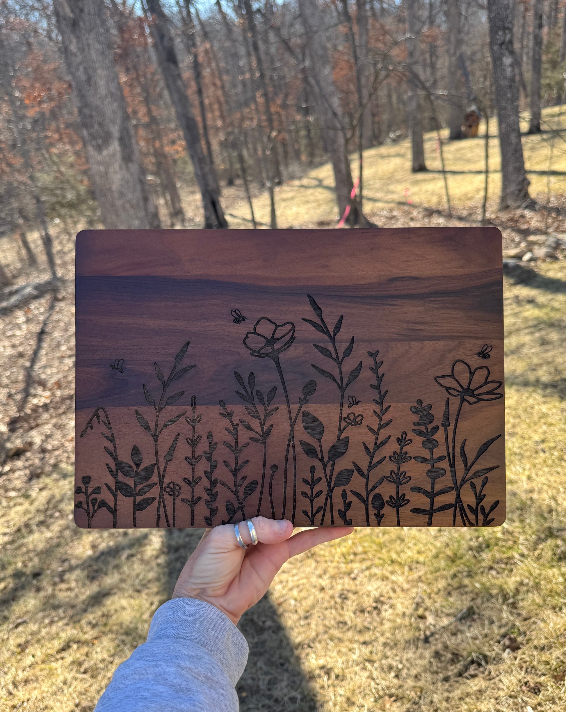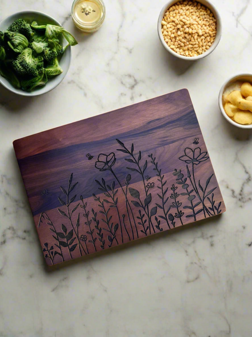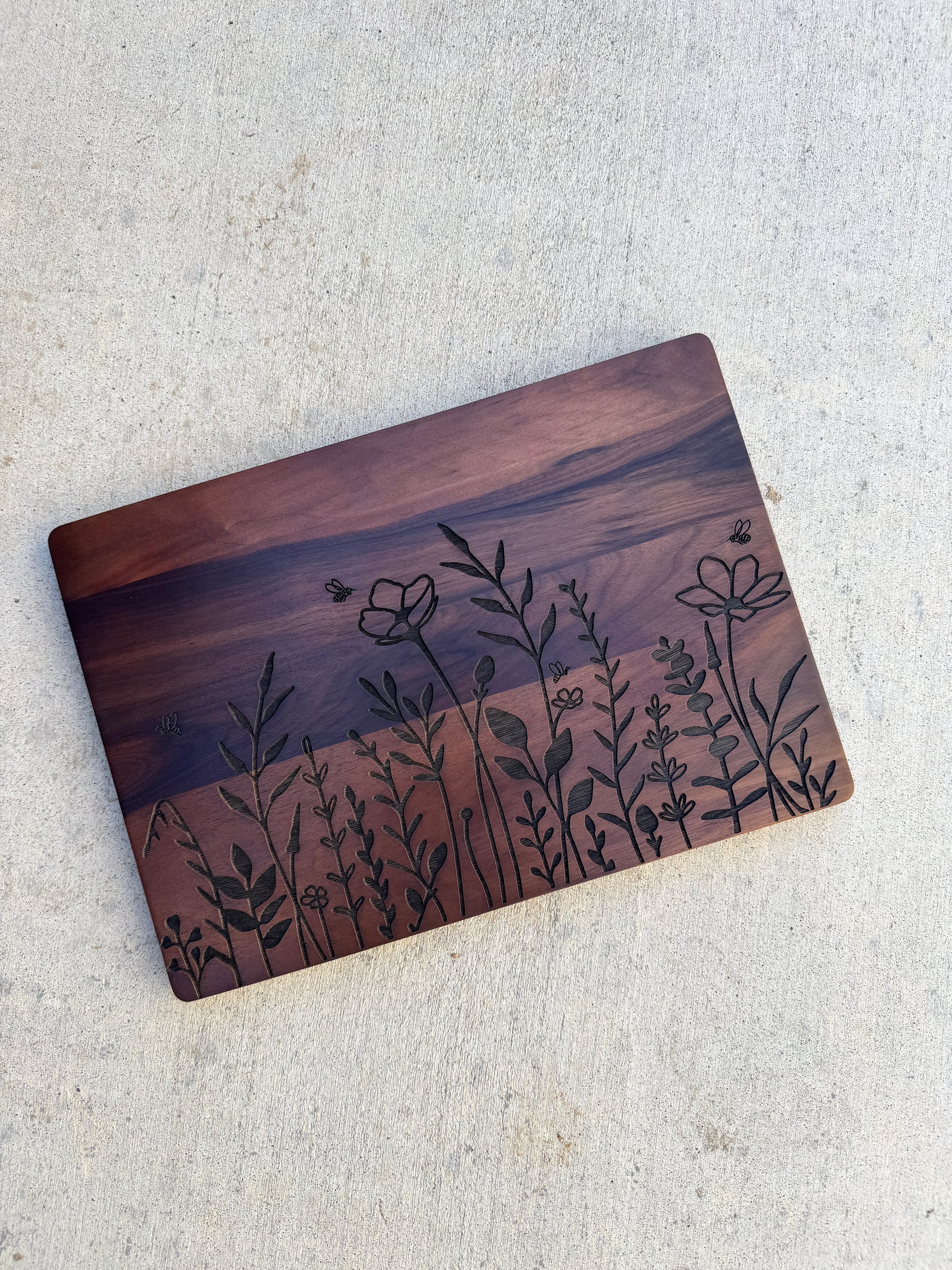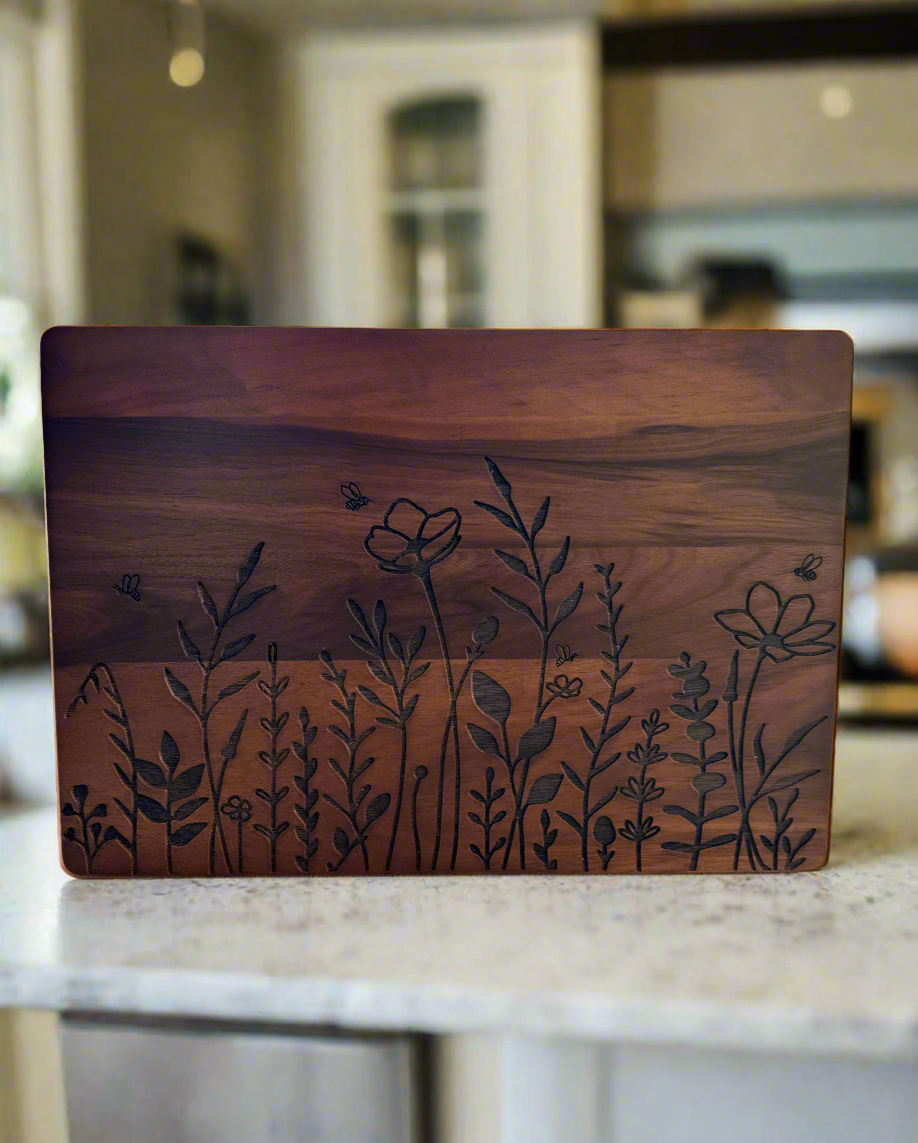Engraved Solid Walnut Cutting Board – Wildflower & Bees Design