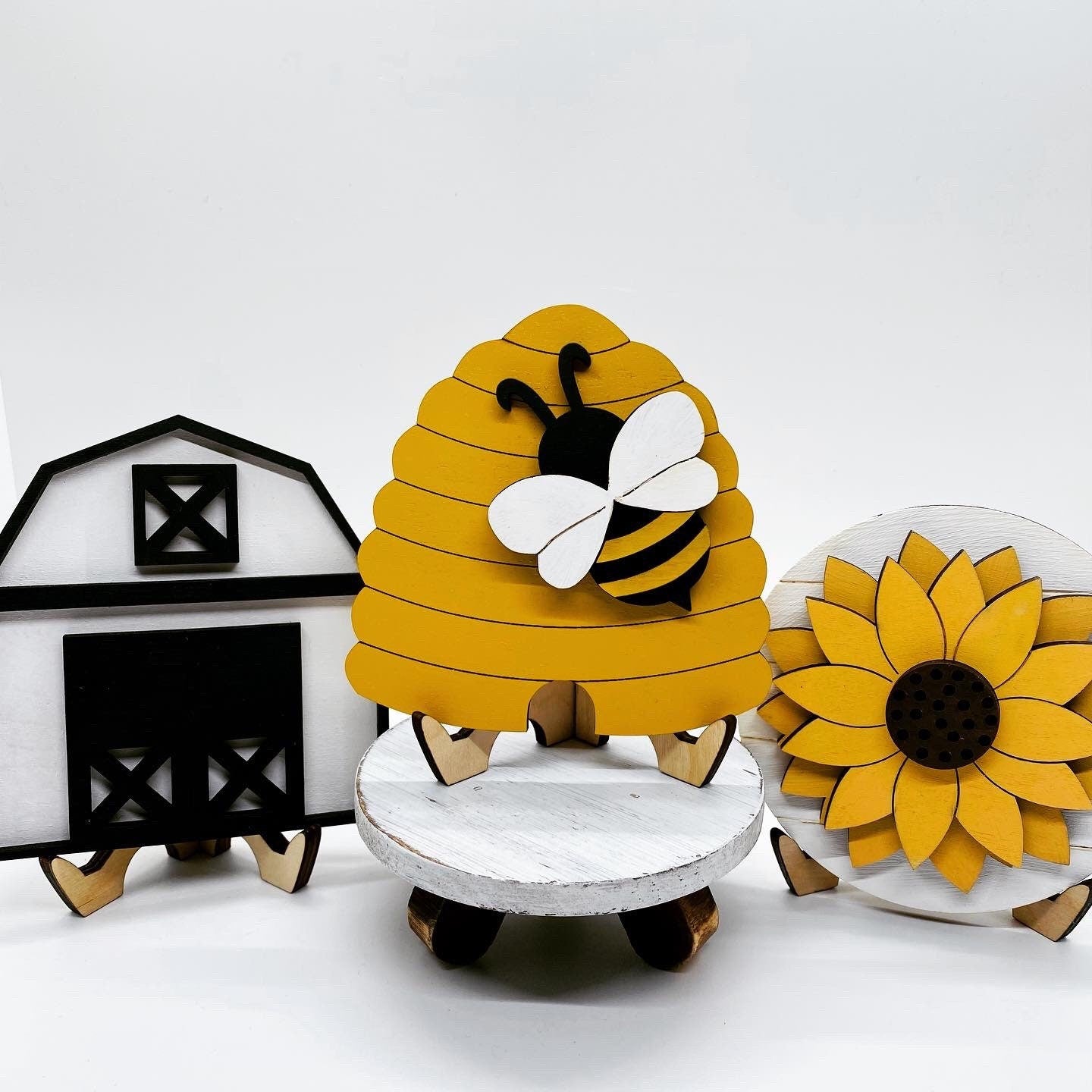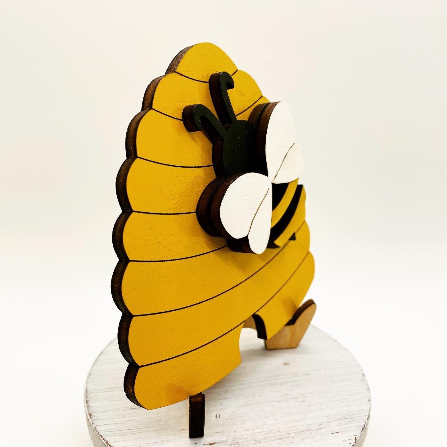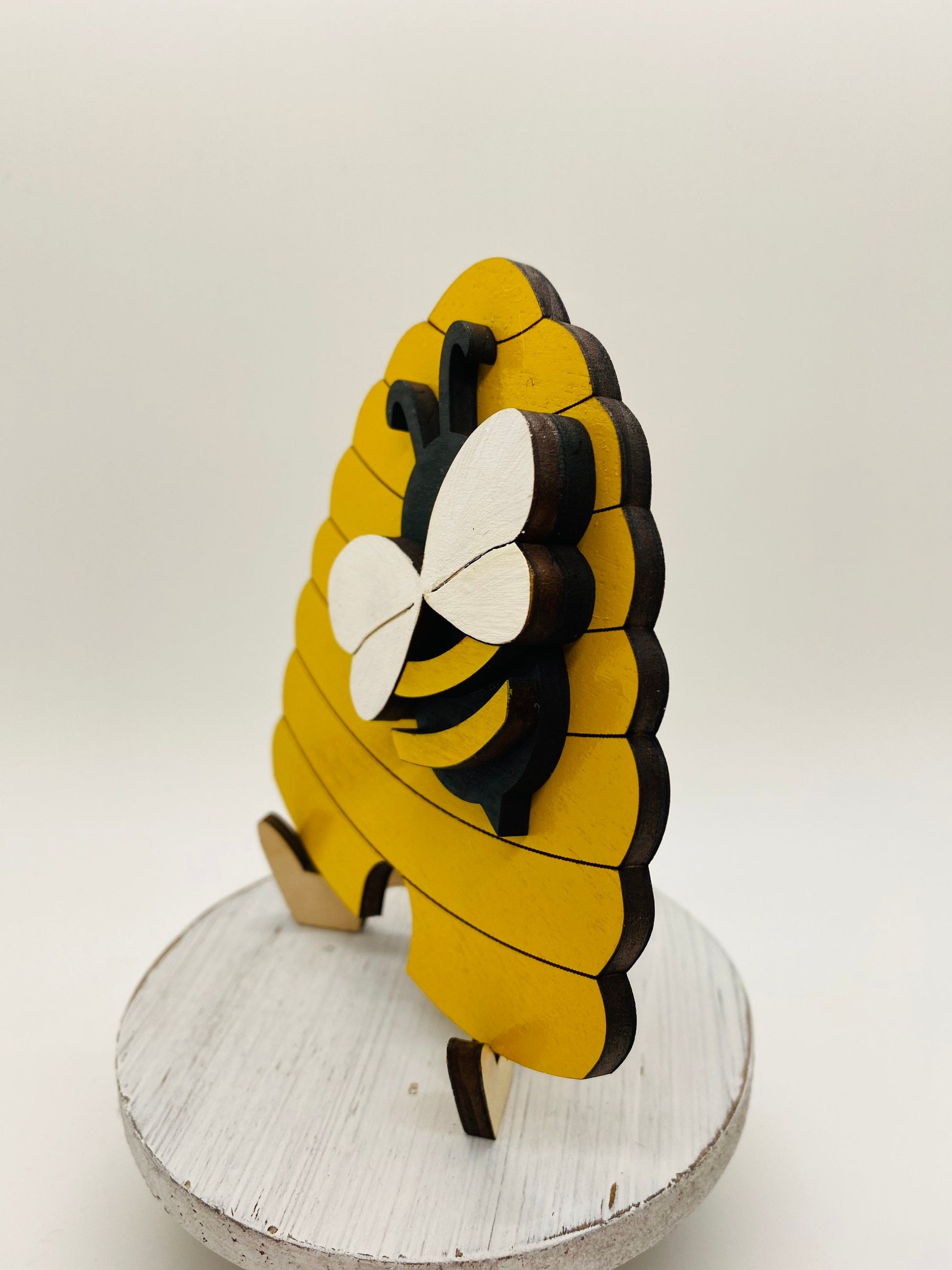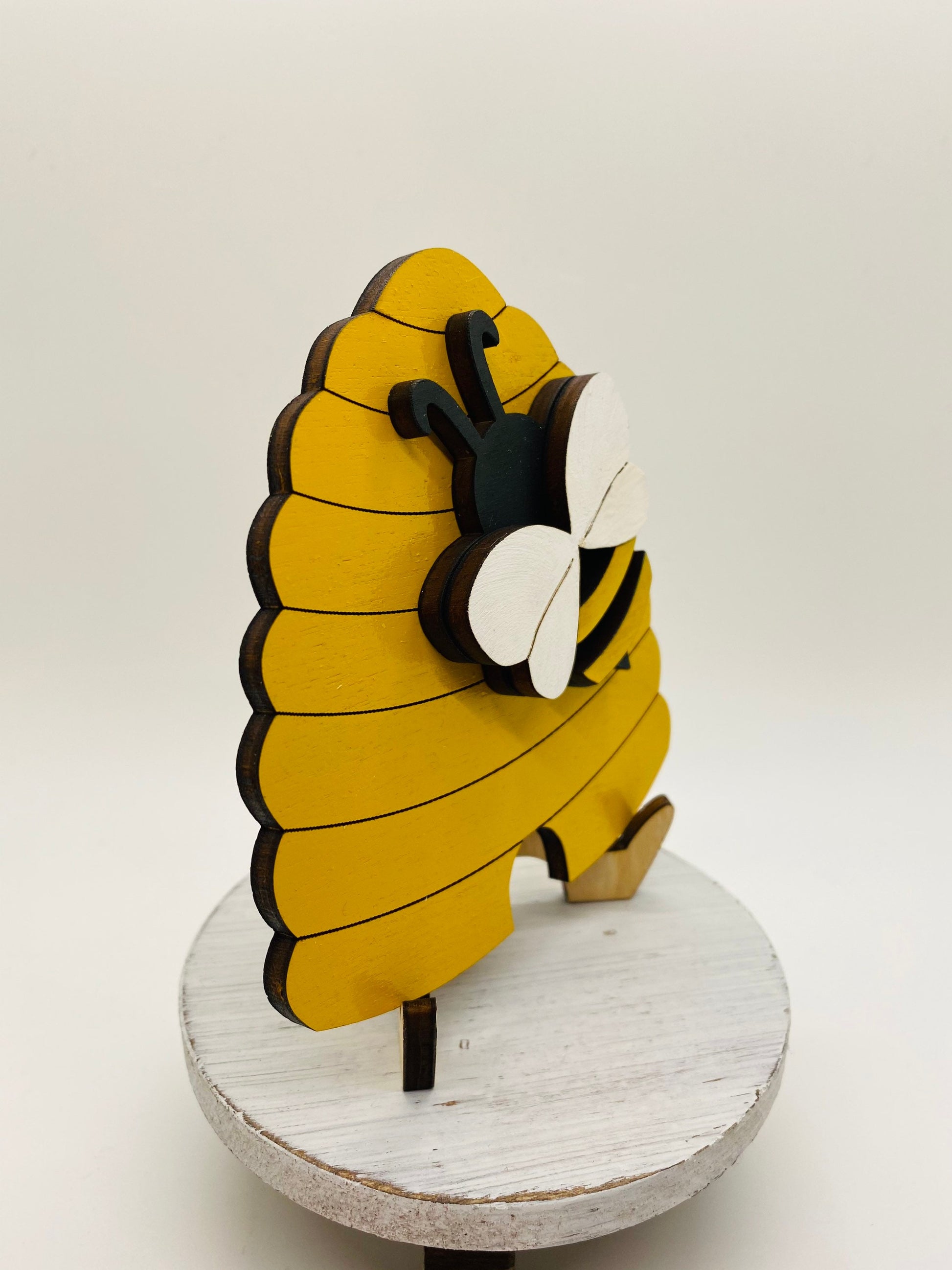 - This laser cut Beehive tiered tray signs measure approximately 4” H x 4” W.