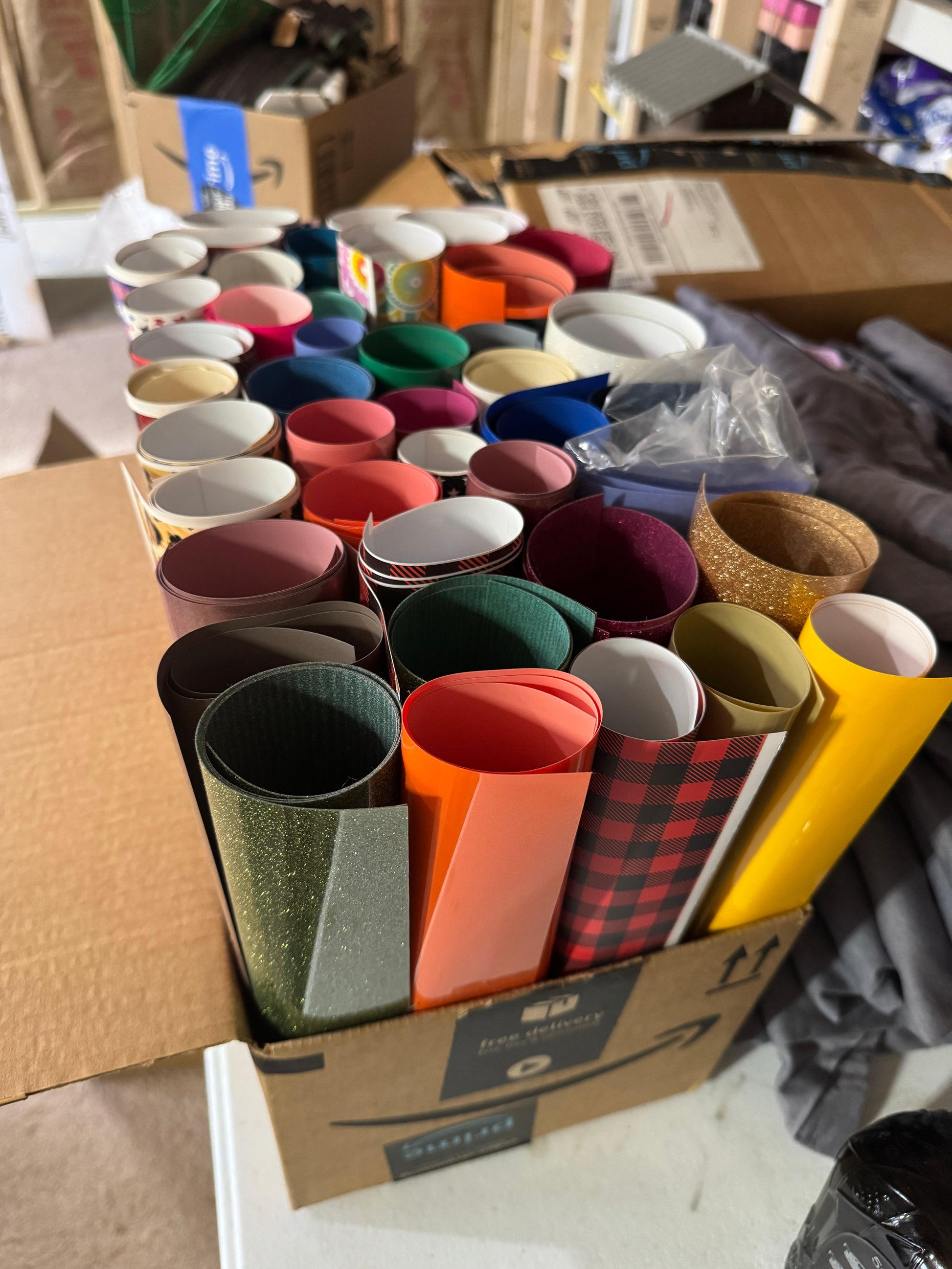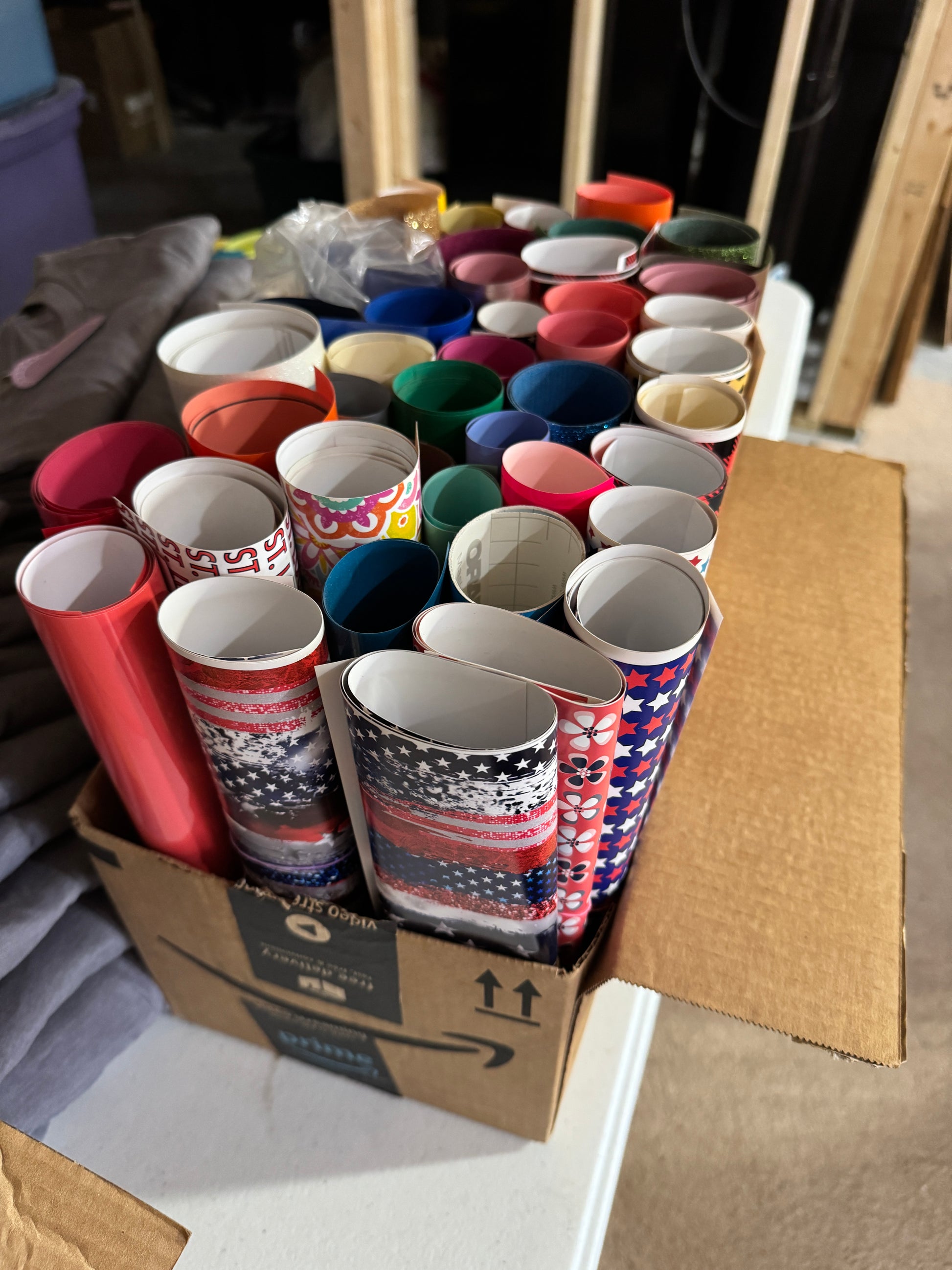 Various colors, patterns and sizes of iron on and HTV Vinyl.