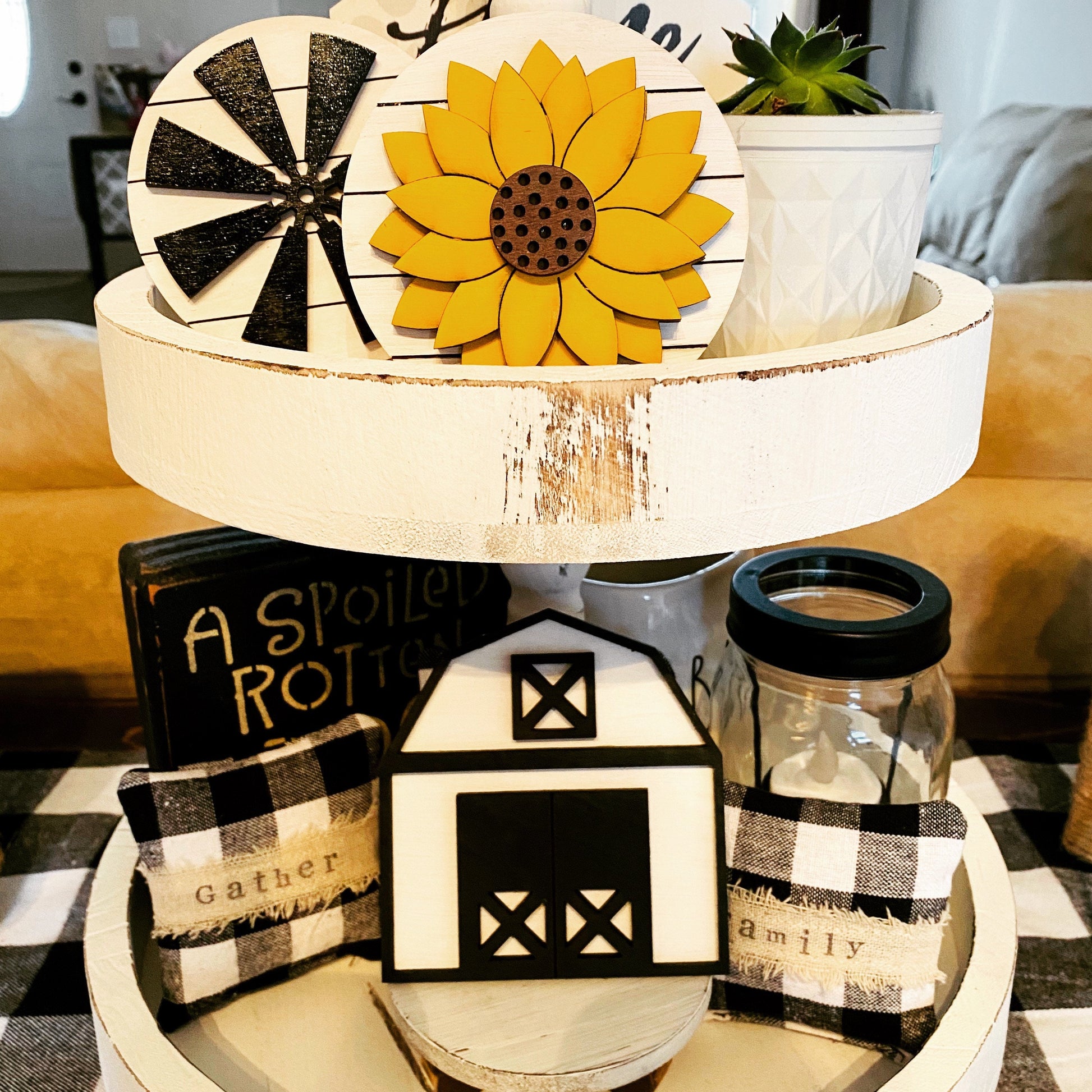 This laser cut Sunflower tiered tray signs measure approximately 4” in diameter. The round has engraved lines to resemble a ship lap look. The designs are painted and attached to the round. Each piece is designed, laser cut and hand painted by me! These add the perfect touch to your tiered tray or sunflower decor. Choose to include our laser cut easel at checkout. If the easel is not chosen the round will need to lean as it’s not free standing. Each piece of wood is unique and no two will be exactly the same. Please don’t hesitate to reach out with any questions! *listing is for the sign and easel if chosen. Other props shown in pictures are not included*