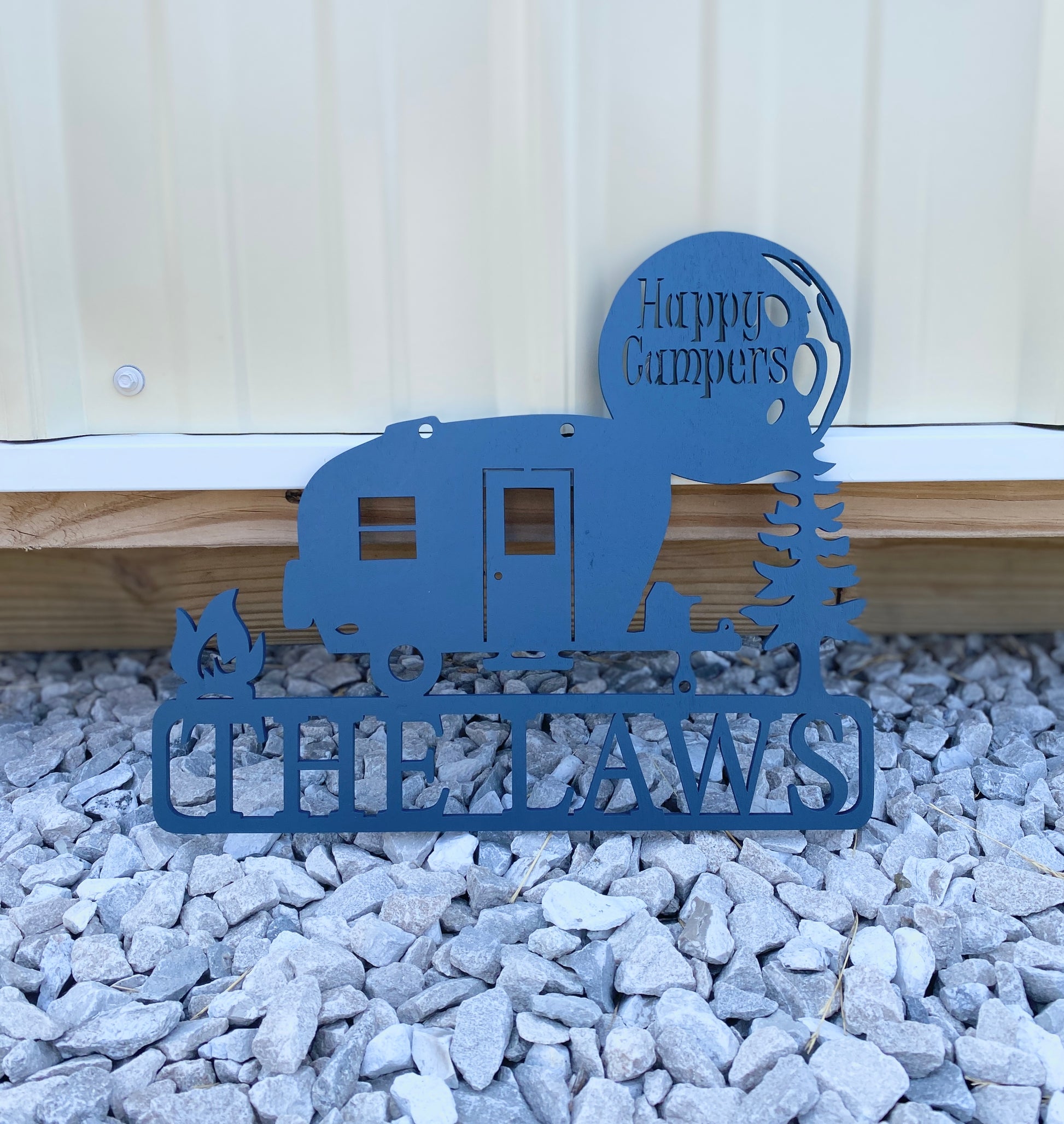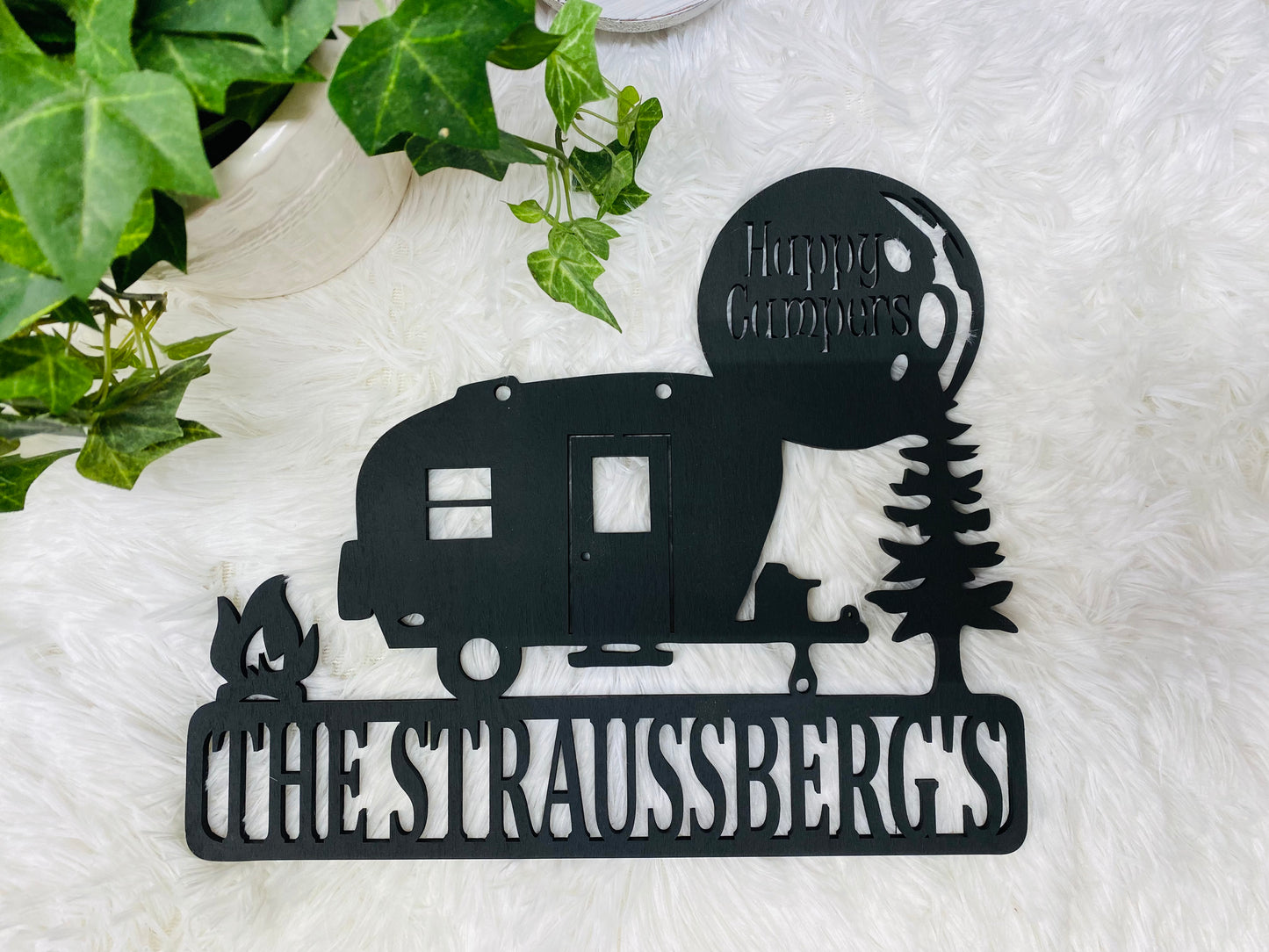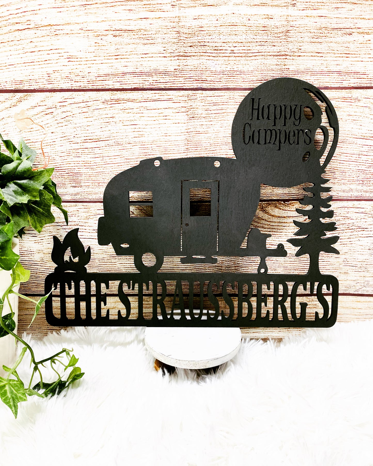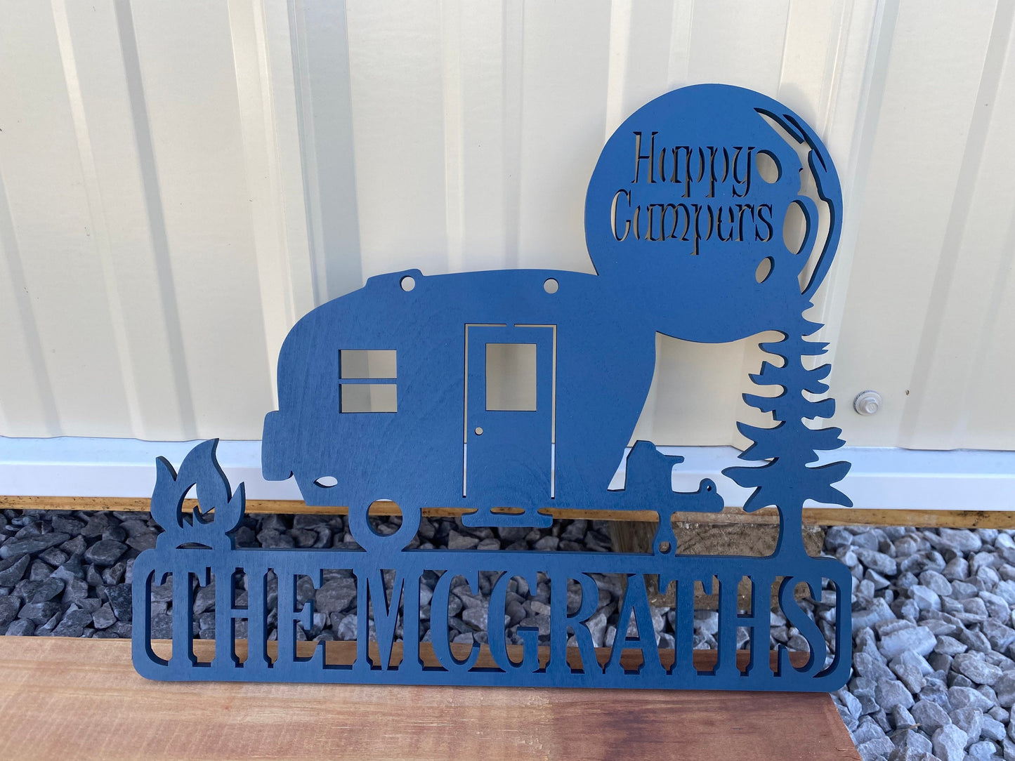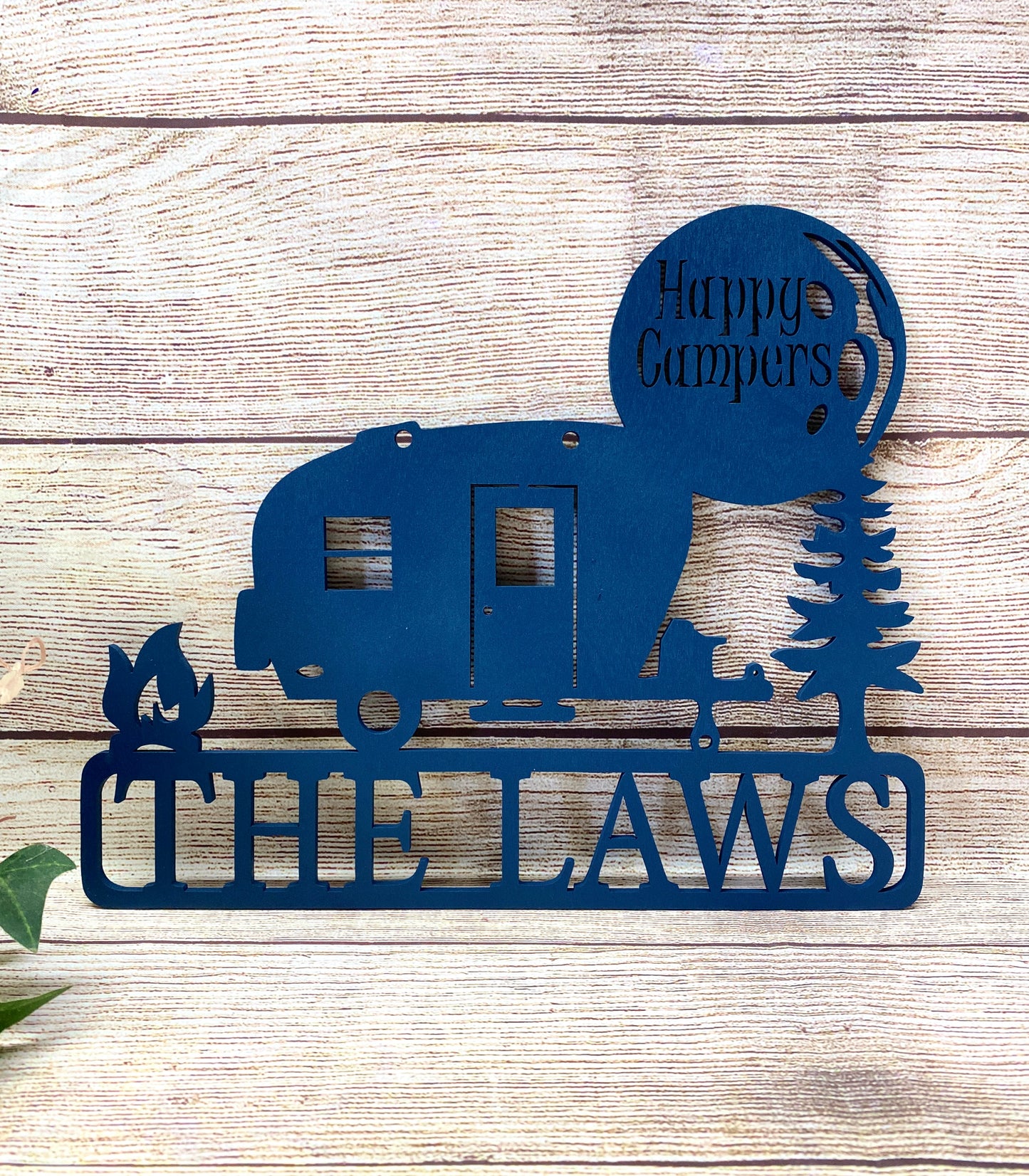 Our personalized family camper sign is laser cut from 1/4” wood. The sign is one piece and can be hung on a door with thin rope or nailed on your desired space. Each sign will look a little different depending on the amount of letters for the last name.