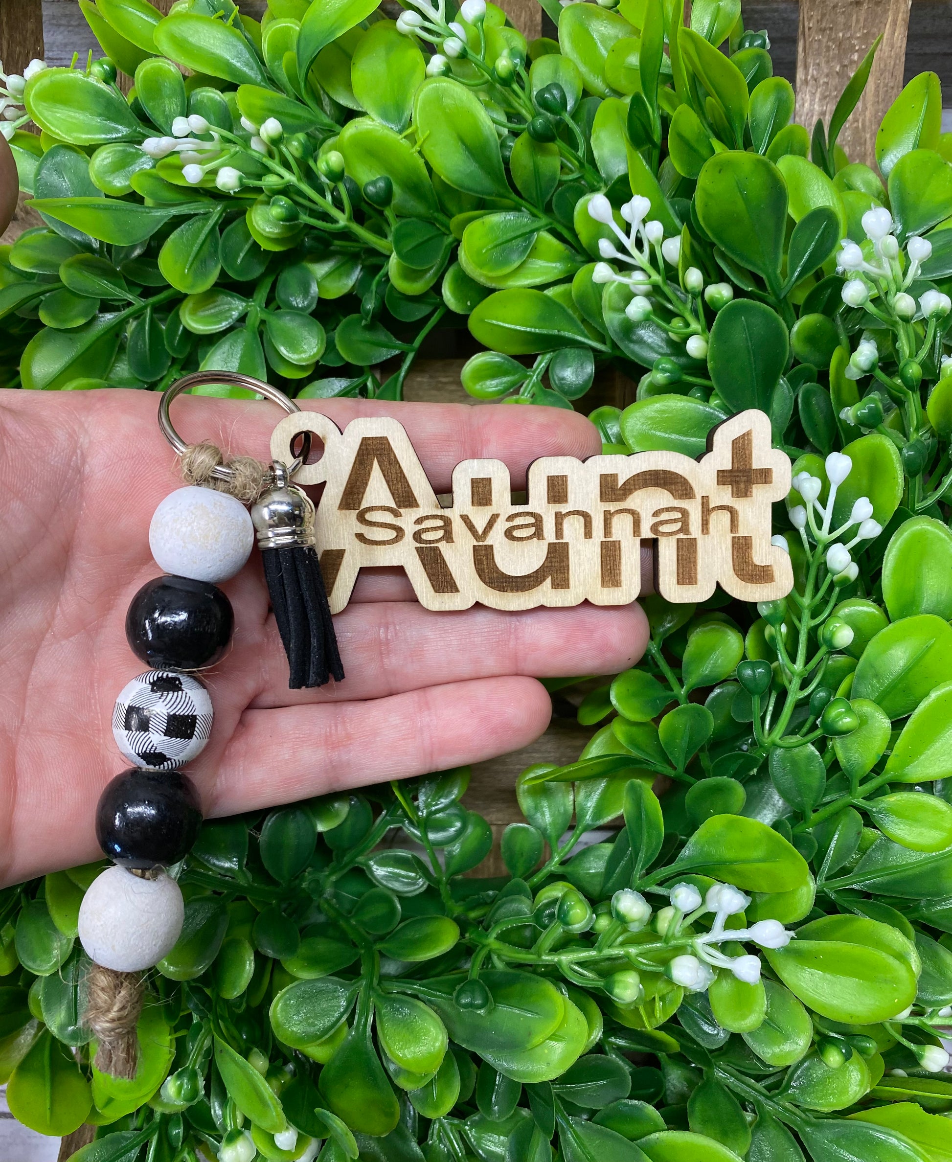- Our Aunt keychains are engraved and cut on 1/4" wood with kids names.