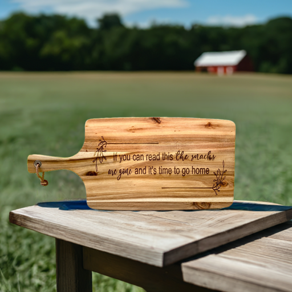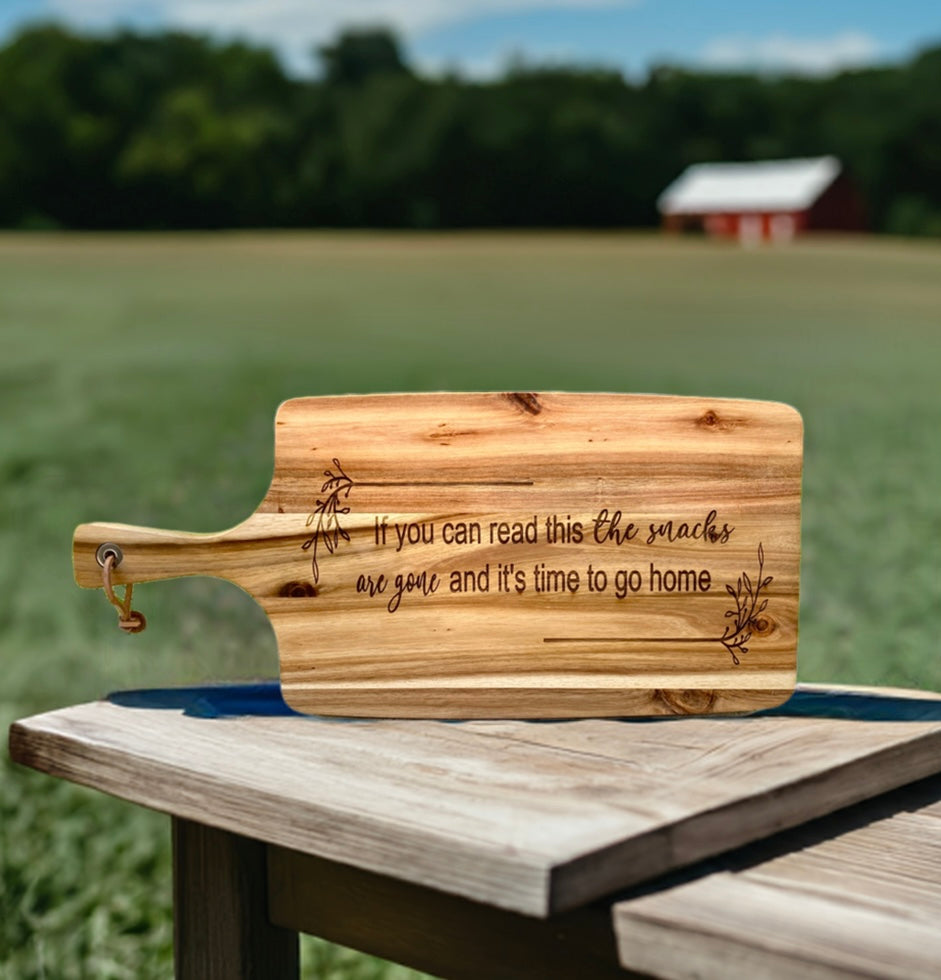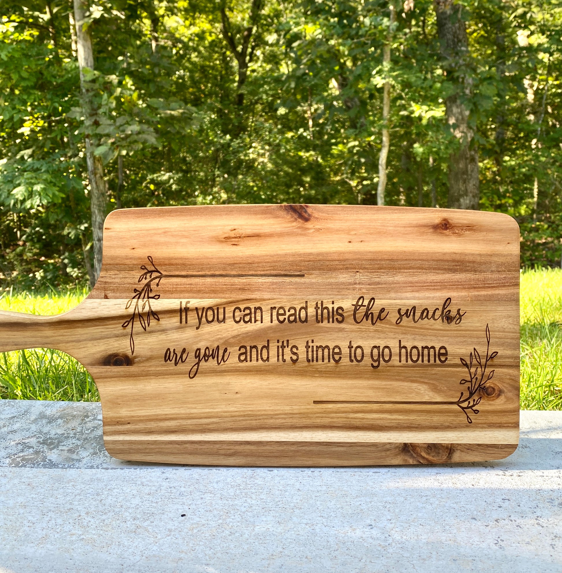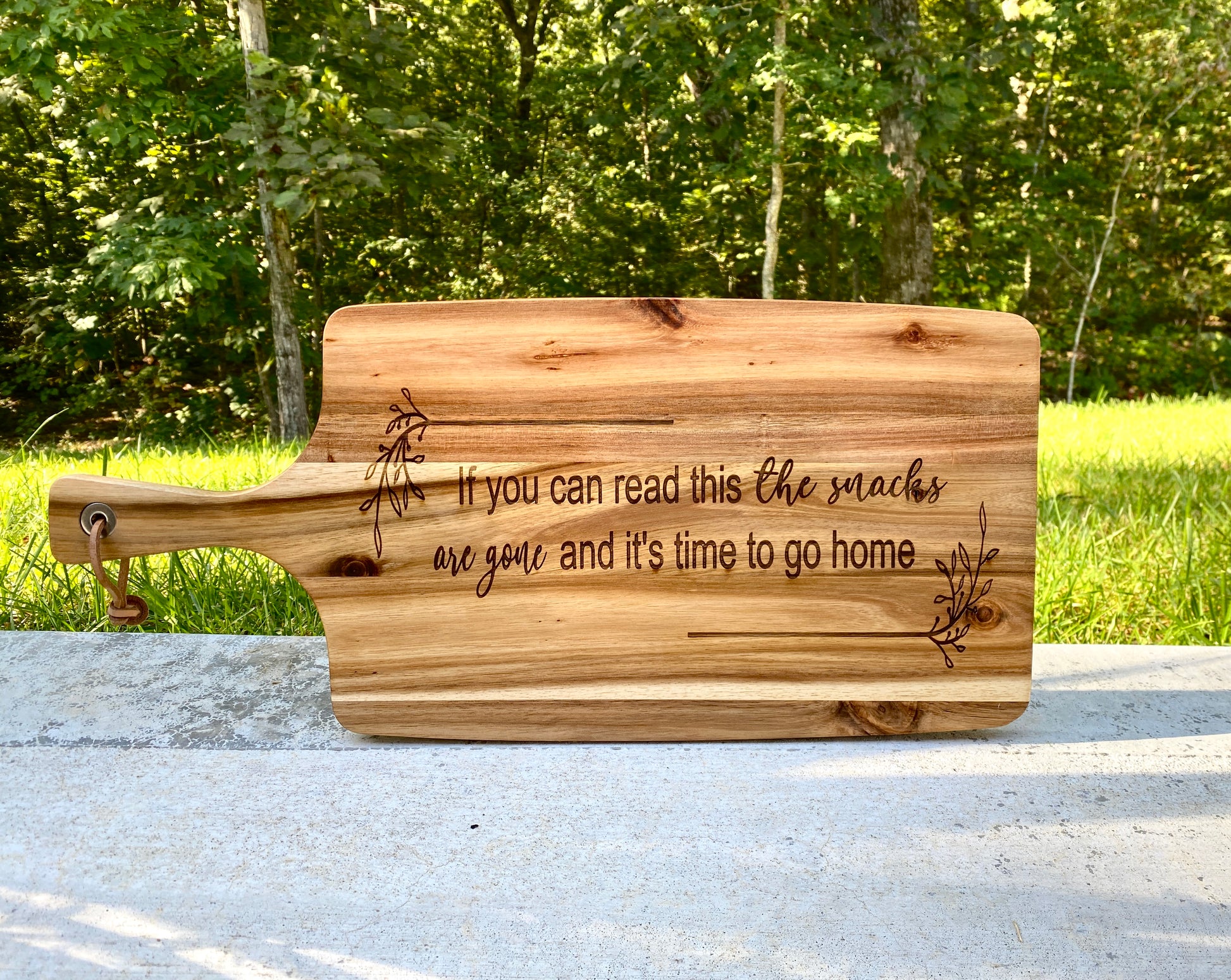 • Stylish Engraving: Features a playful engraving that reads, "If you can read this, the snacks are gone and it’s time to go home," adding a humorous touch to any gathering.