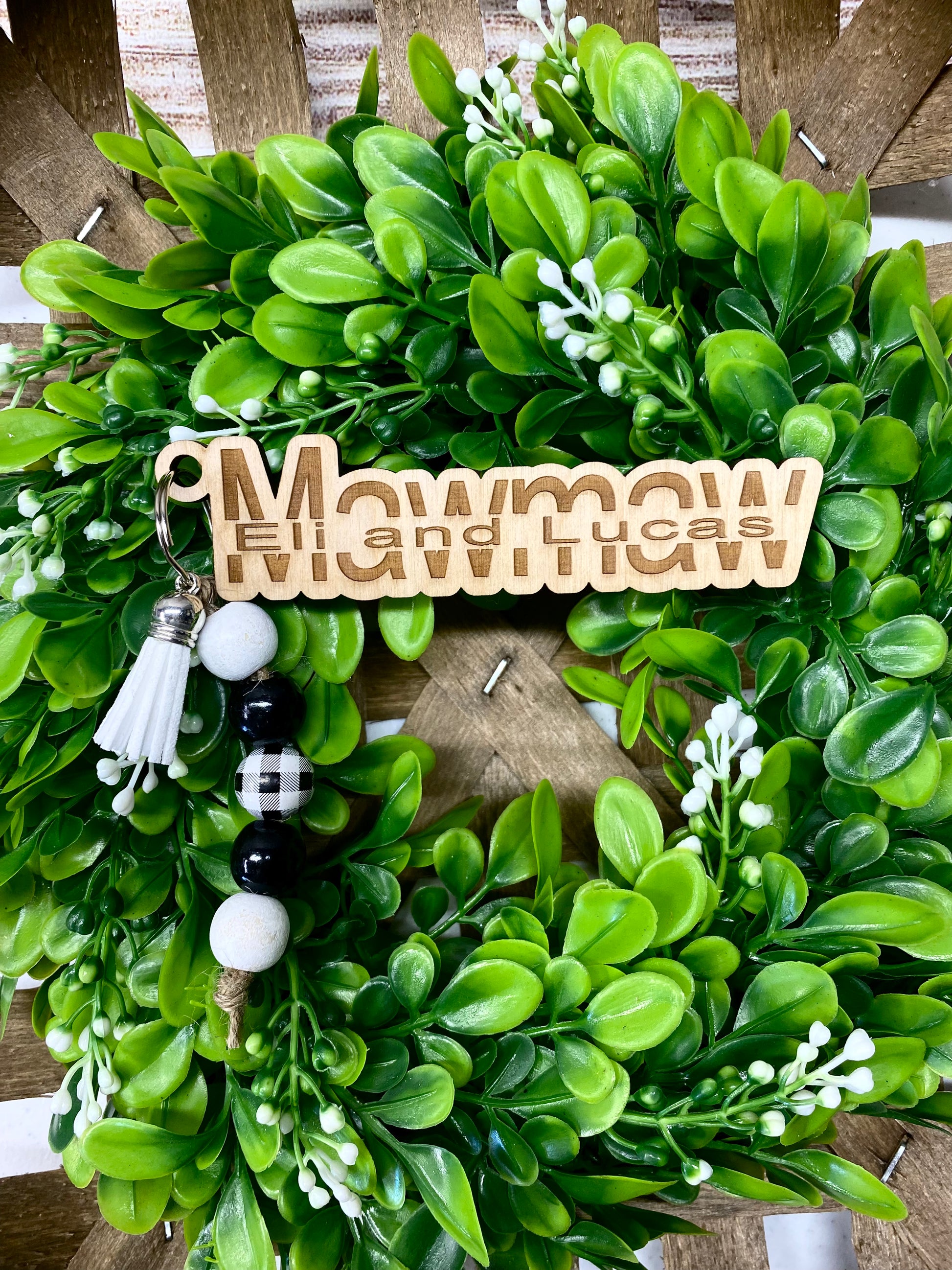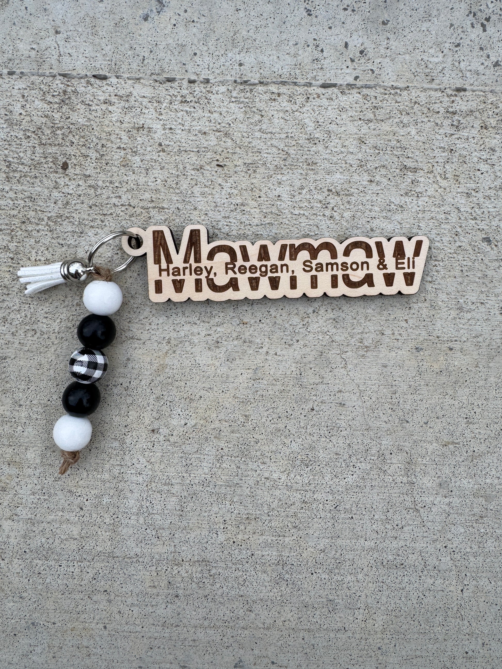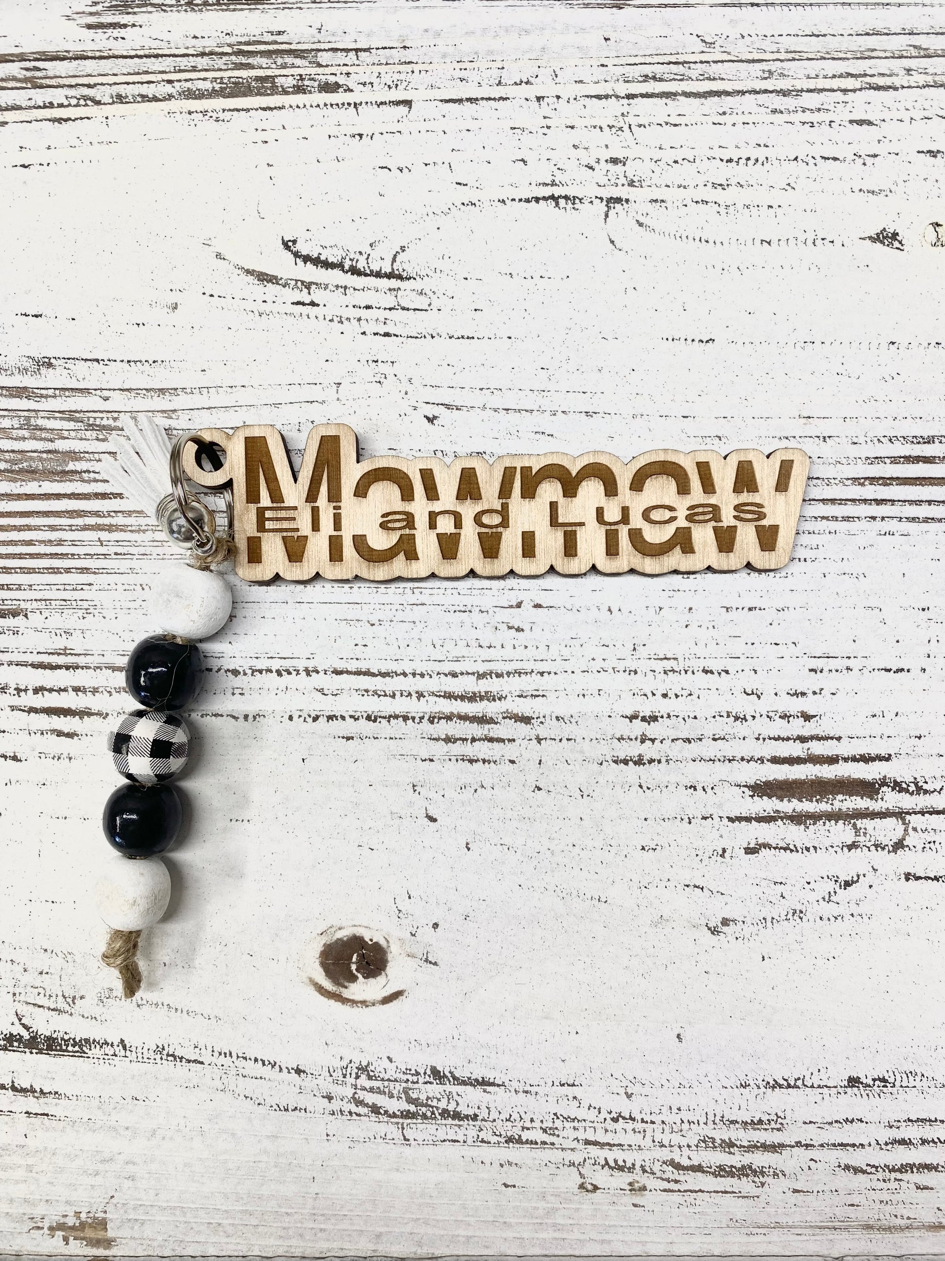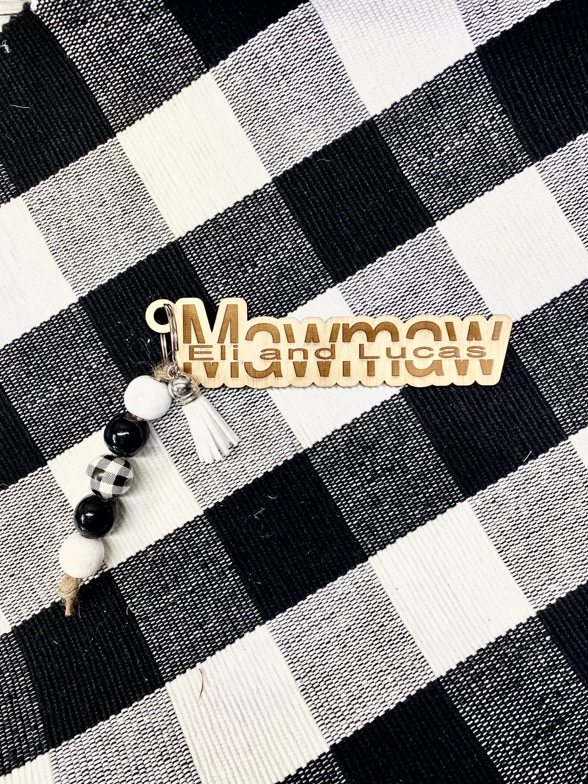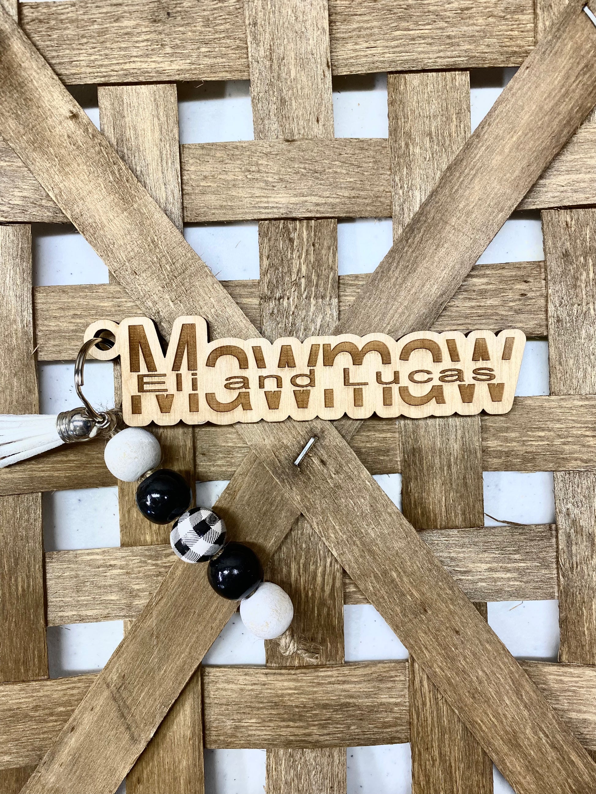 Our Mawmaw keychains are engraved and cut on 1/4" wood with grandkids names. We add a keyring, white tassel, string with black and white beads. The overall length from end to end is approximately 10" (spread out). The length from a hanging position is about 5". We can add up to 5 names per keychain. The longer the names, the smaller the lettering will be to fit in the space provided. These make great gift for Mawmaw (Grandma) for Mother's Day or Grandparent's Day. Please do not hesitate to reach out with any questions you may have. Happy to help!