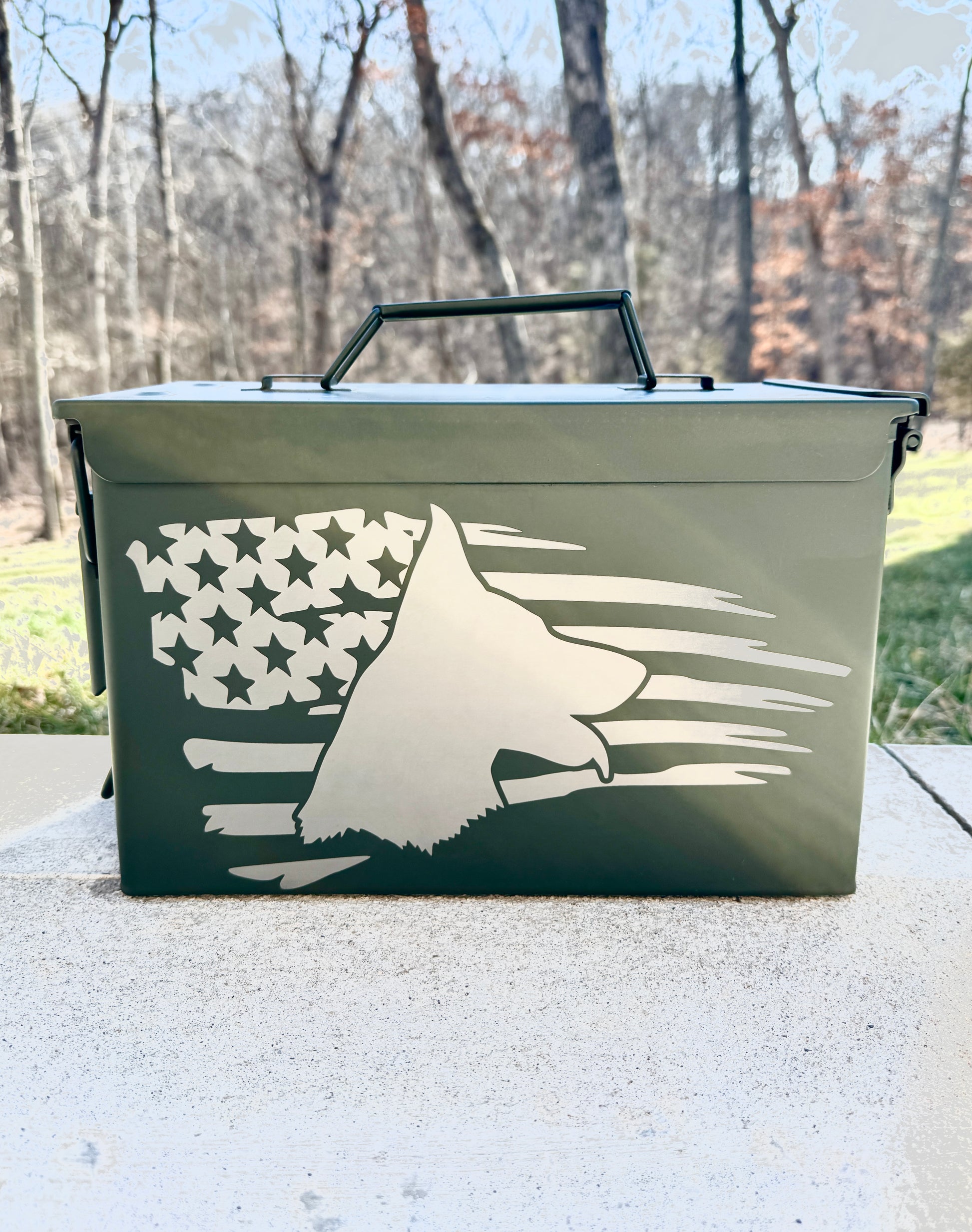 Upgrade your storage with our premium 50 caliber ammunition can laser engraved with the iconic American flag. Durable, versatile, and proudly patriotic, this precision-engraved ammo can is perfect for safeguarding your supplies while showcasing your allegiance. Get yours today and add a touch of Americana to your collection!