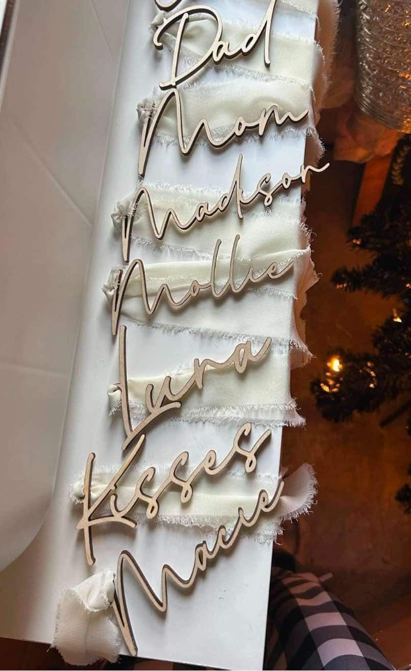 Finished with a luxurious cream chiffon ribbon (approximately 12" total in length), these tags make a stunning addition to stockings, gift wrapping, or holiday decor. Ideal for creating a personalized, cohesive look for your family’s Christmas display, these wooden tags are beautiful.