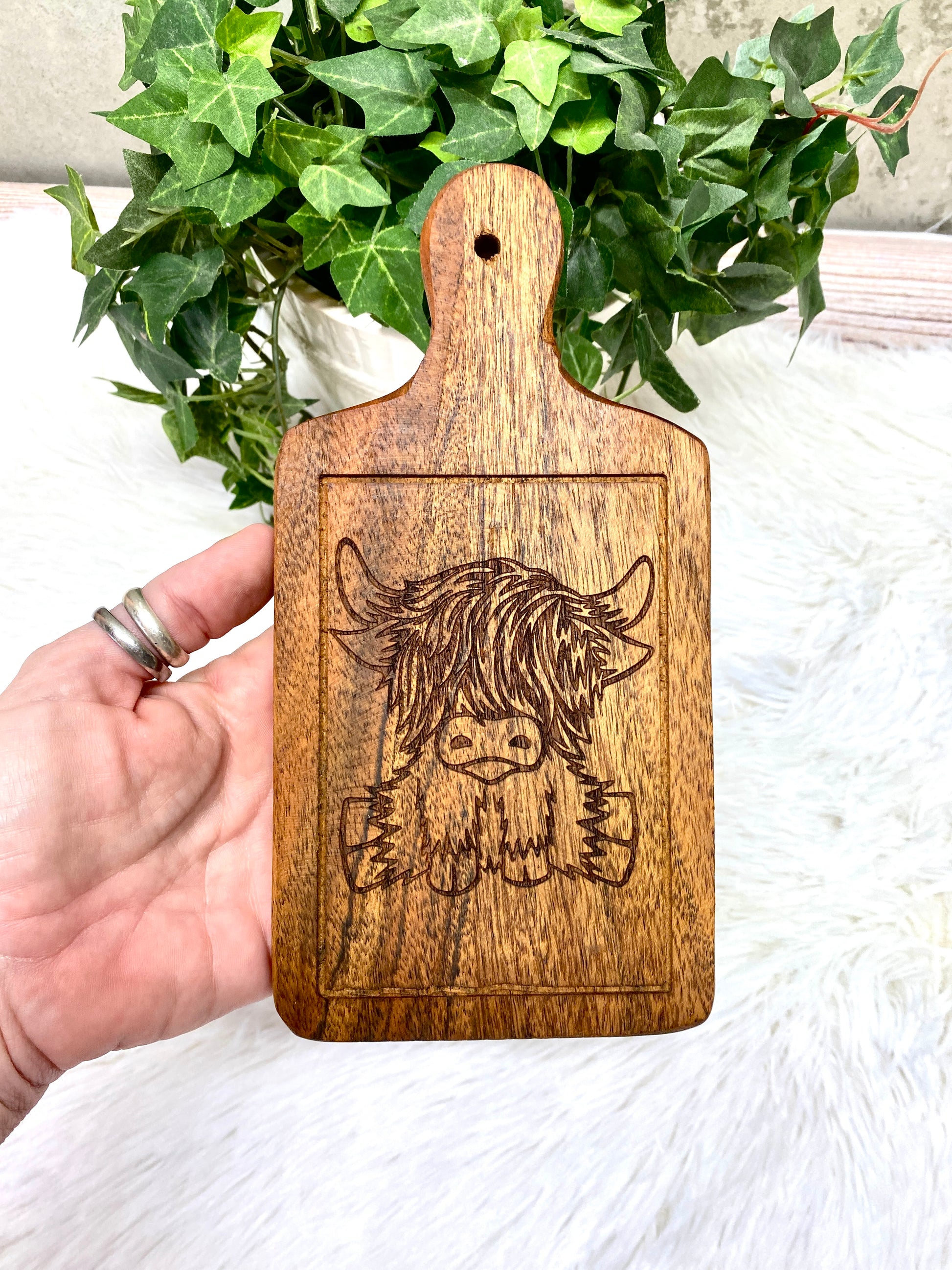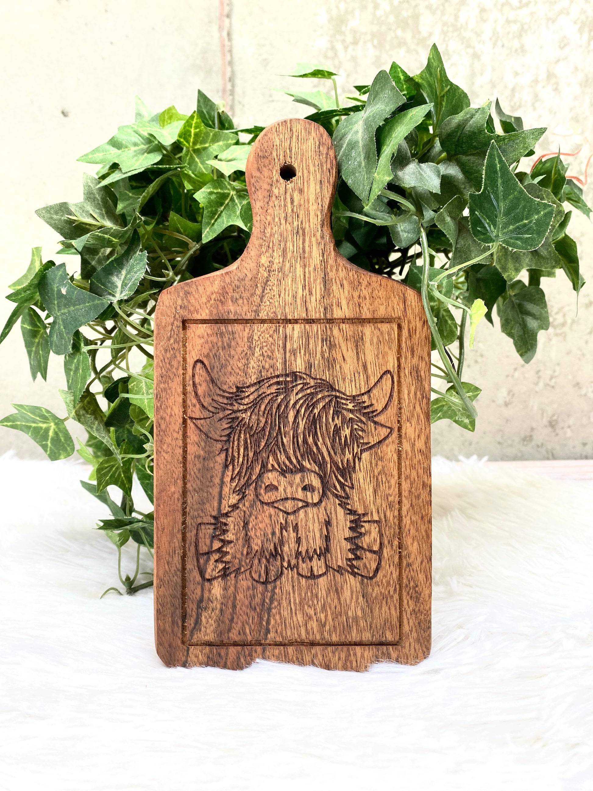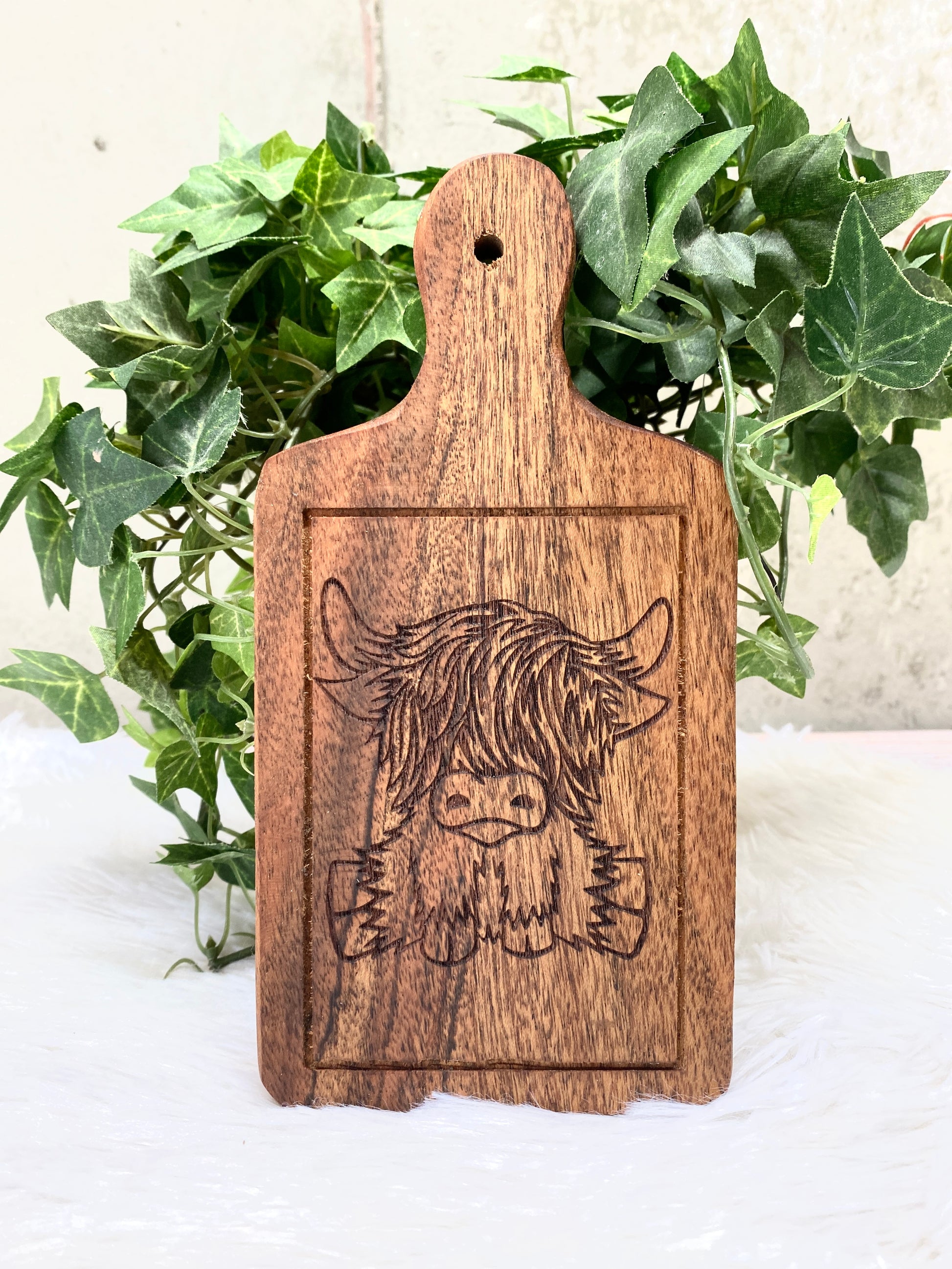 Our small personalized cutting boards make the perfect gift for the highland cow and cheese lover. Gather around the table and enjoy cheese, crackers and wine with friends and family. Hang on your wall after use to decorate your kitchen, dining area or tiered tray. Our boards will last a lifetime and more.