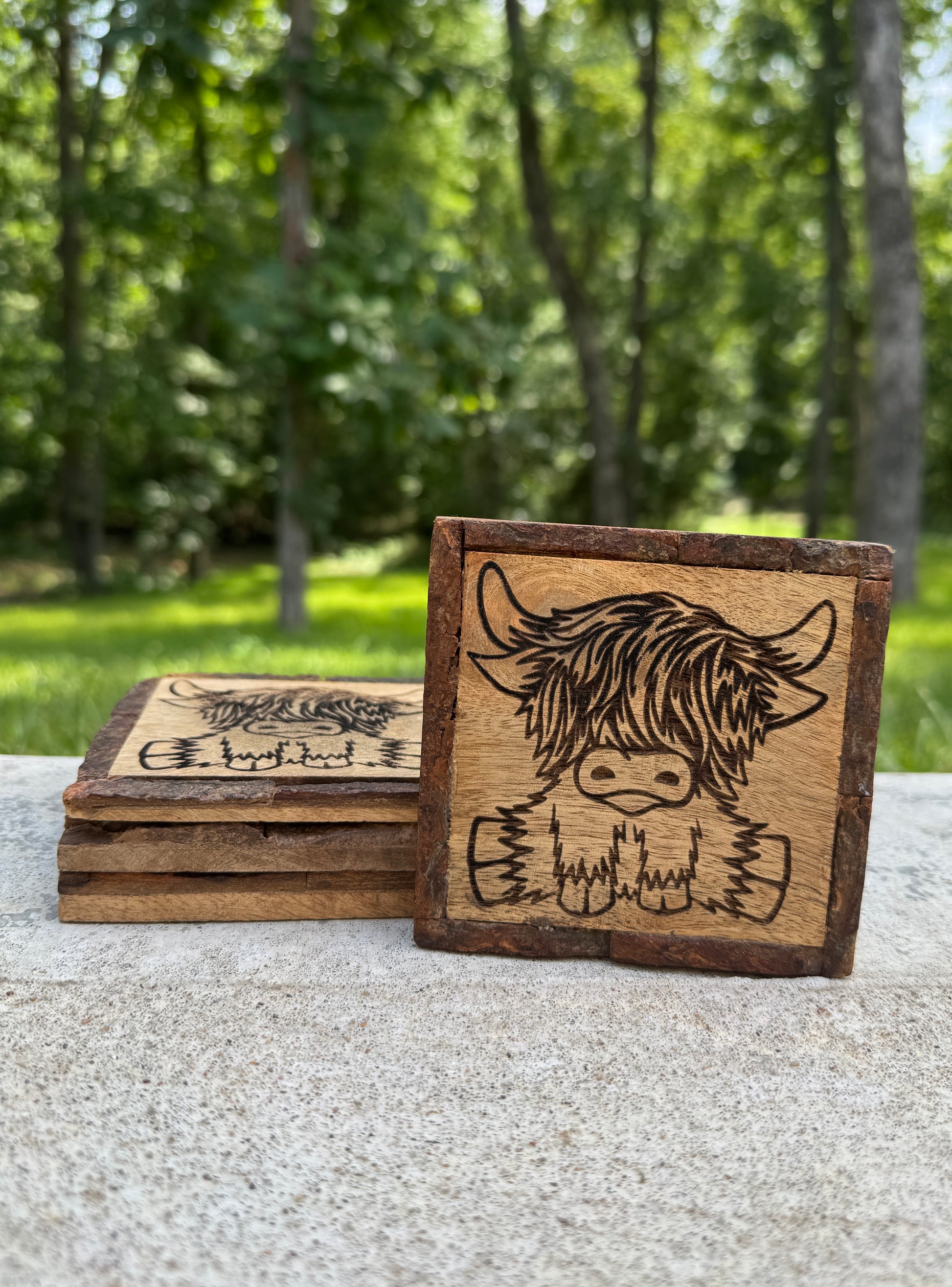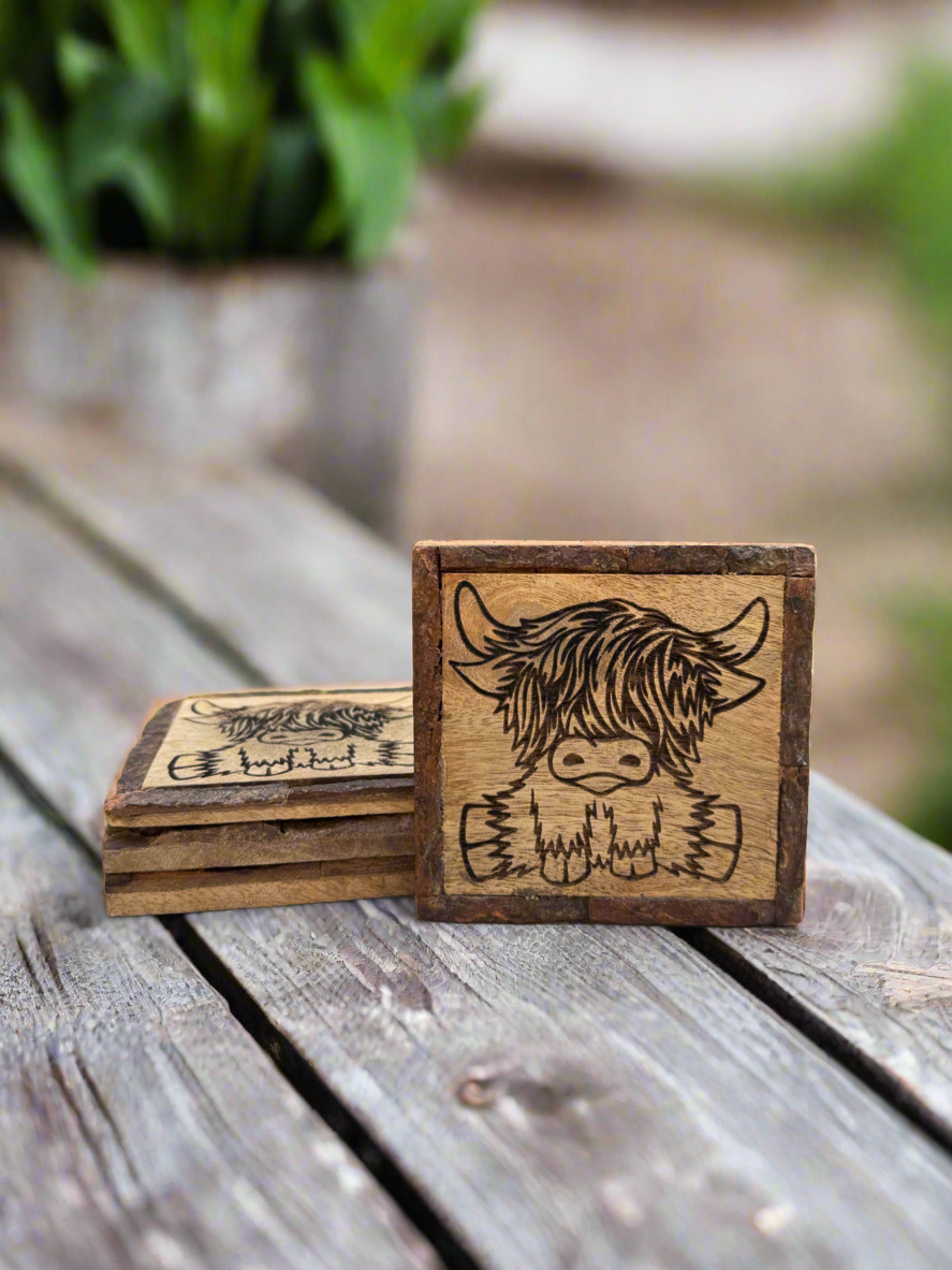Introducing Highland Cow Coasters - exquisitely handcrafted from acacia wood with an eye-catching highland cow design! Bring rustic charm and unique style to your home decor - liven up your coffee table with these exquisite coasters and make every gathering a conversation starter! Coasters come in a set of 4!
