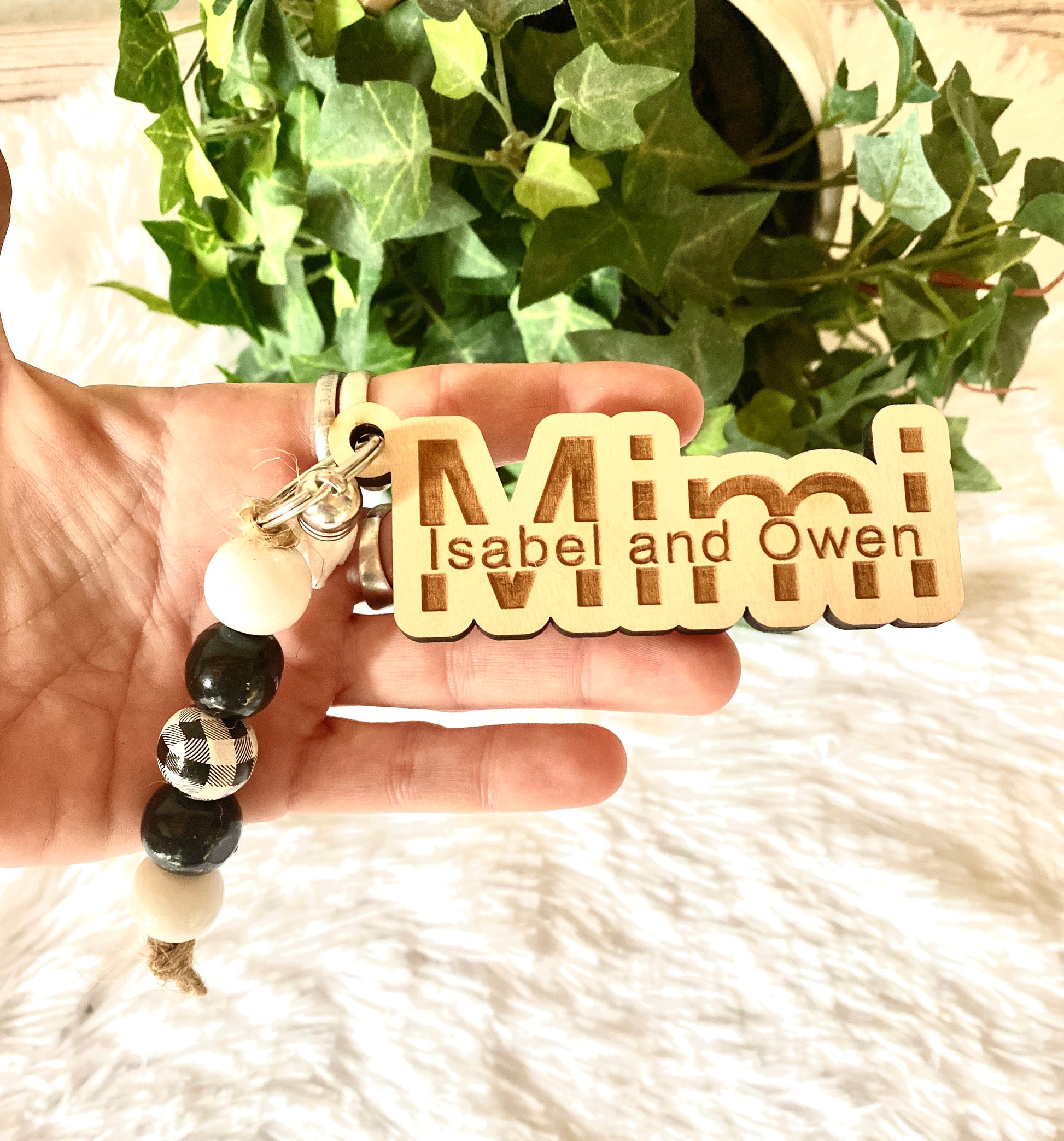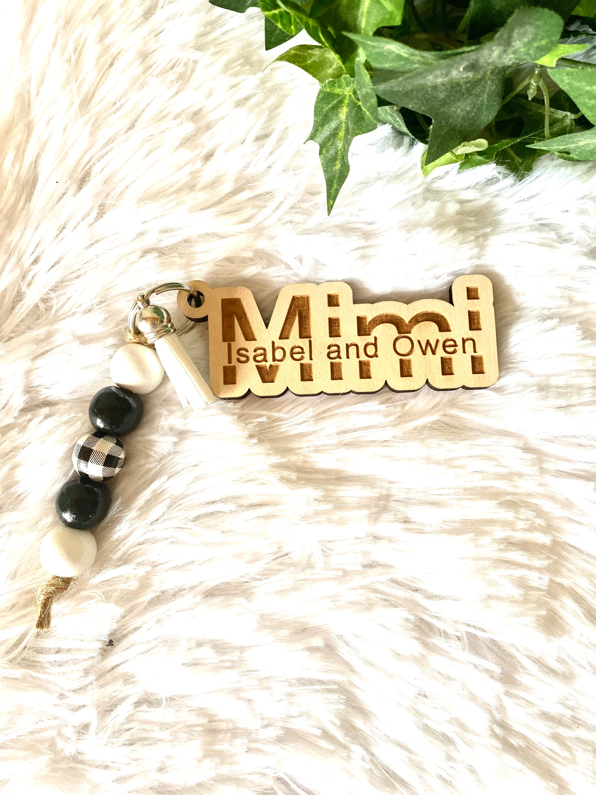 Our Mimi keychains are engraved and cut on 1/4" wood with grandkids names. We add a keyring, white tassel, string with black and white beads. The overall length from end to end is approximately 10" (spread out). The length from a hanging position is about 5". We can add up to 5 names per keychain. The longer the names, the smaller the lettering will be to fit in the space provided. These make great gift for Mimi (Grandma) for Mother's Day or Grandparent's Day. Please do not hesitate to reach out with any questions you may have. Happy to help!