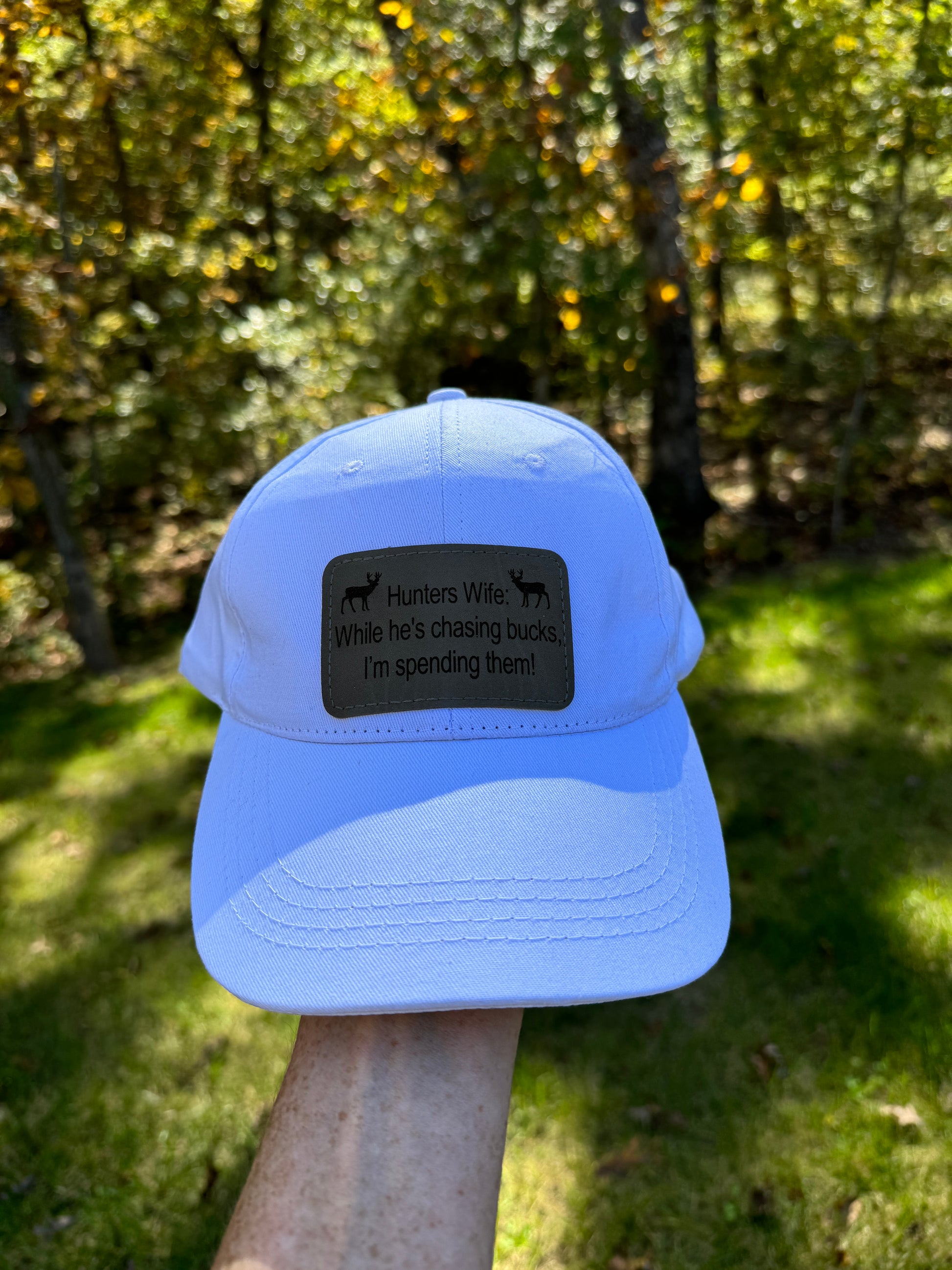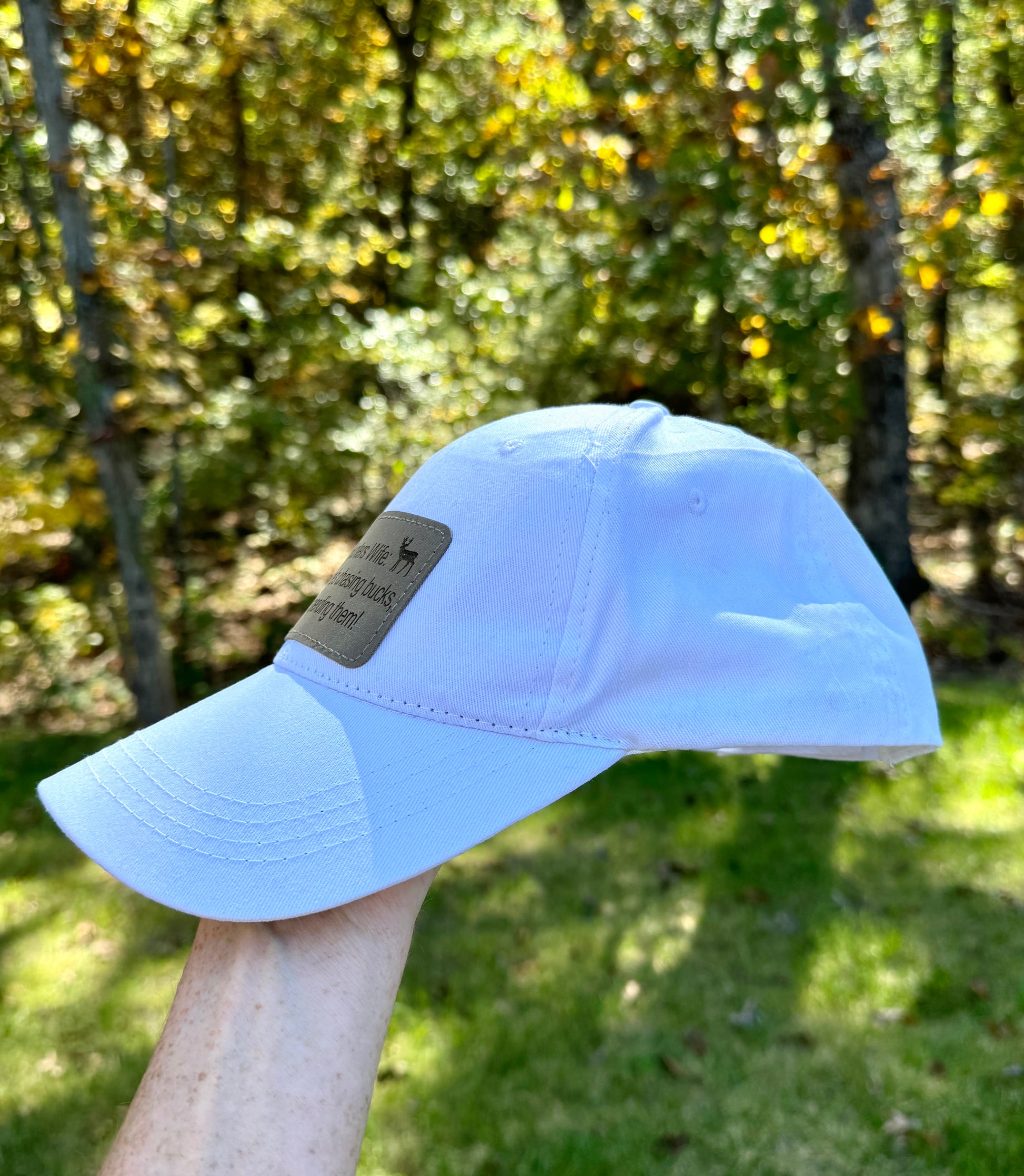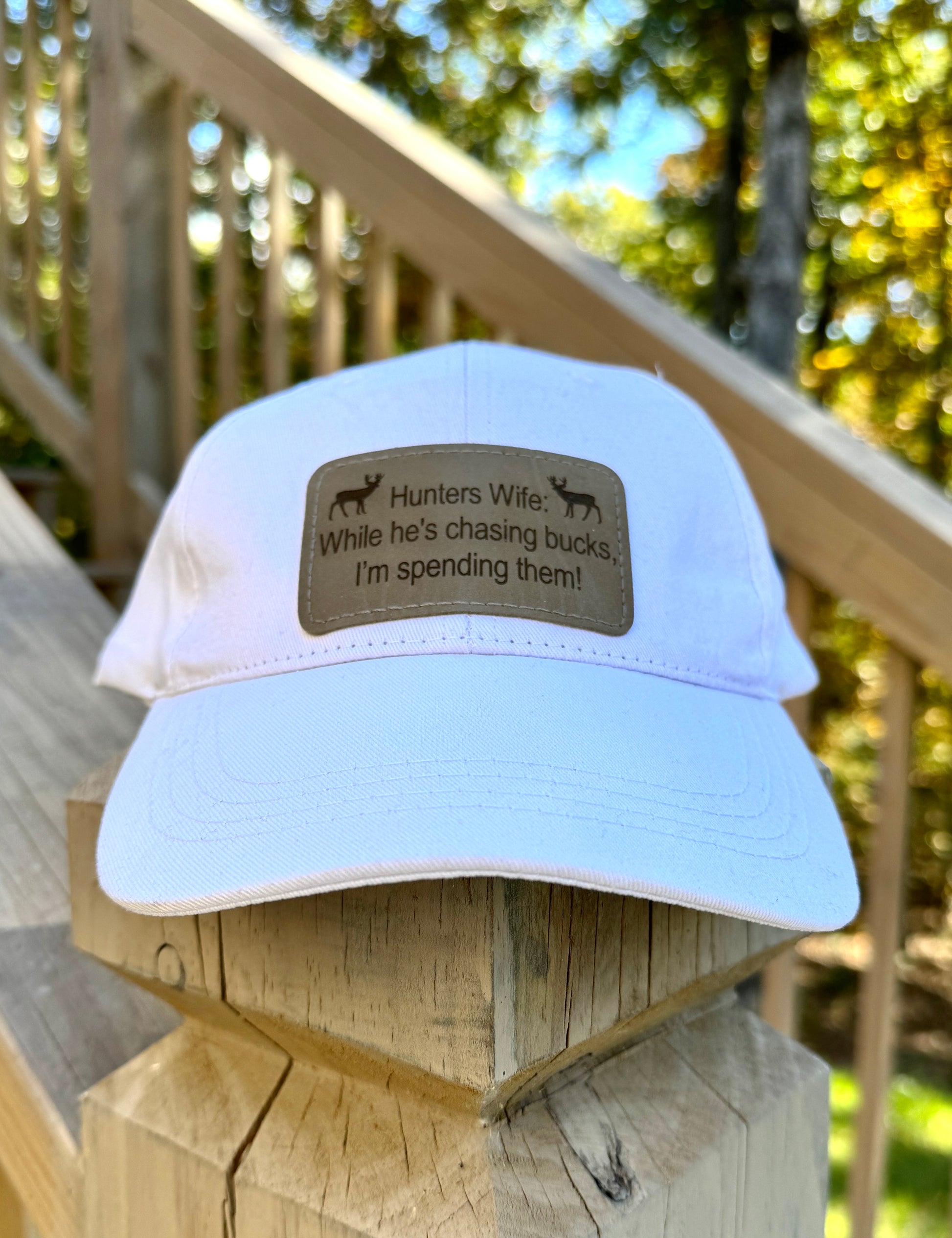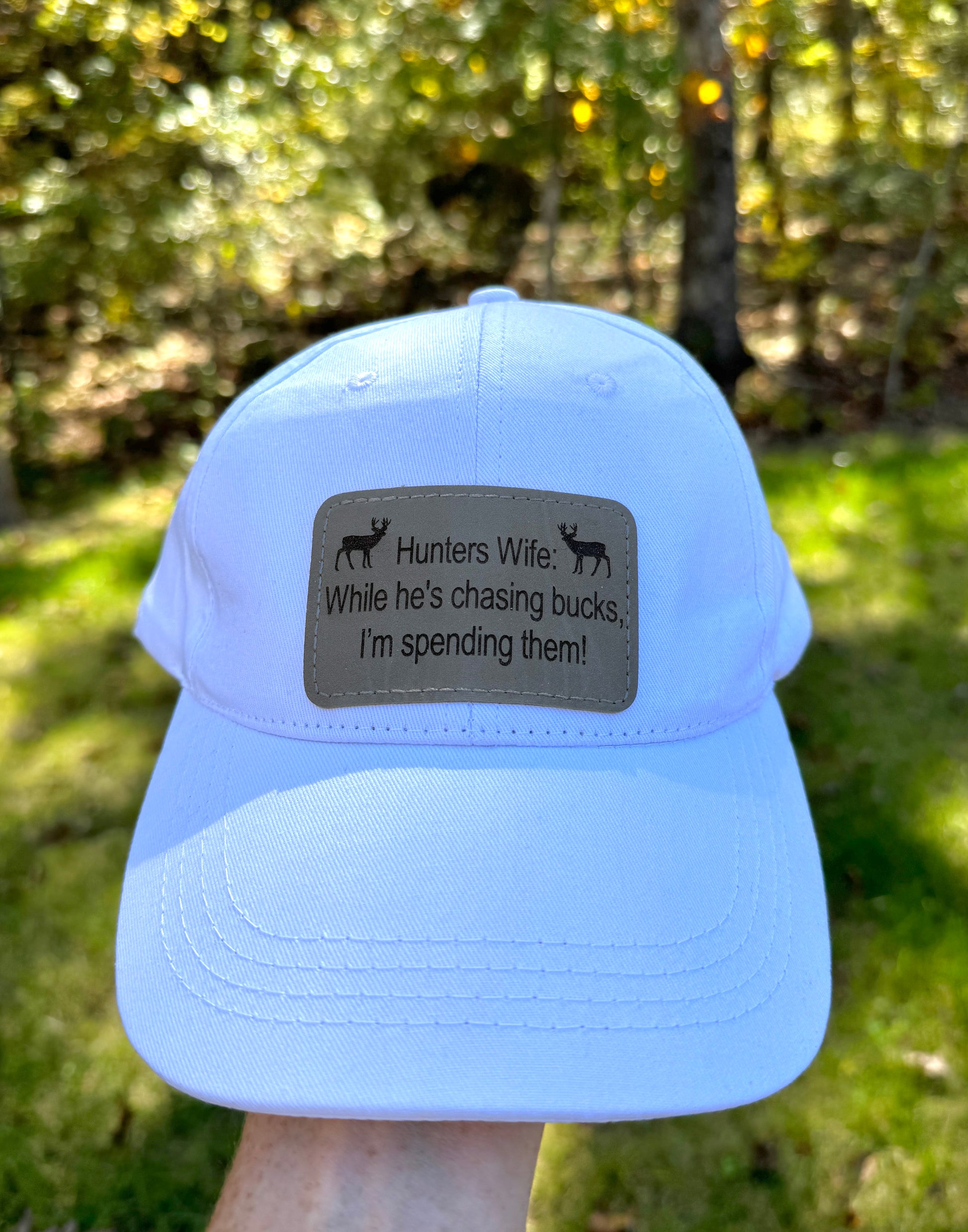 Turn heads with this stylish white baseball cap, featuring a laser-engraved leatherette patch that boldly reads, "While he's chasing bucks, I'm spending them!" Perfect for adding a touch of humor and personality to your everyday look. The high-quality leatherette patch is precision-engraved for lasting durability, while the cap offers a comfortable, adjustable fit for all-day wear. Whether you're out shopping or enjoying a casual day outdoors, this cap is a fun, fashionable accessory. Makes a great gift for yourself or the shopping enthusiast in your life!