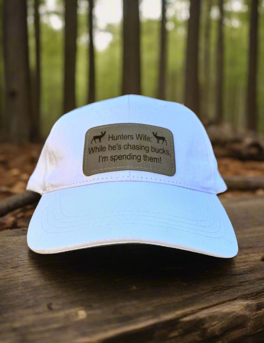 White Baseball Cap with Leatherette Patch - "While He's Chasing Bucks, I'm Spending Them!"