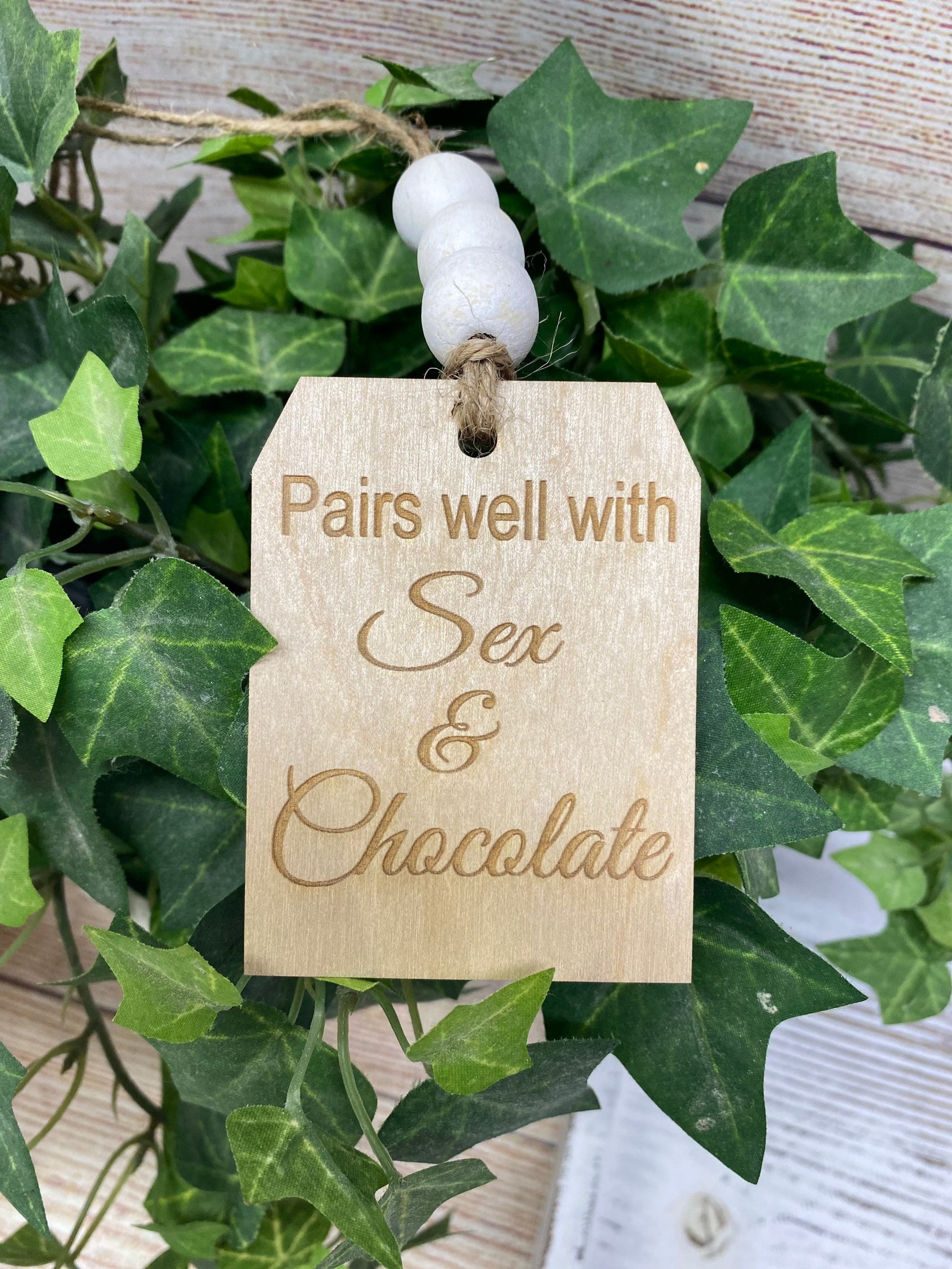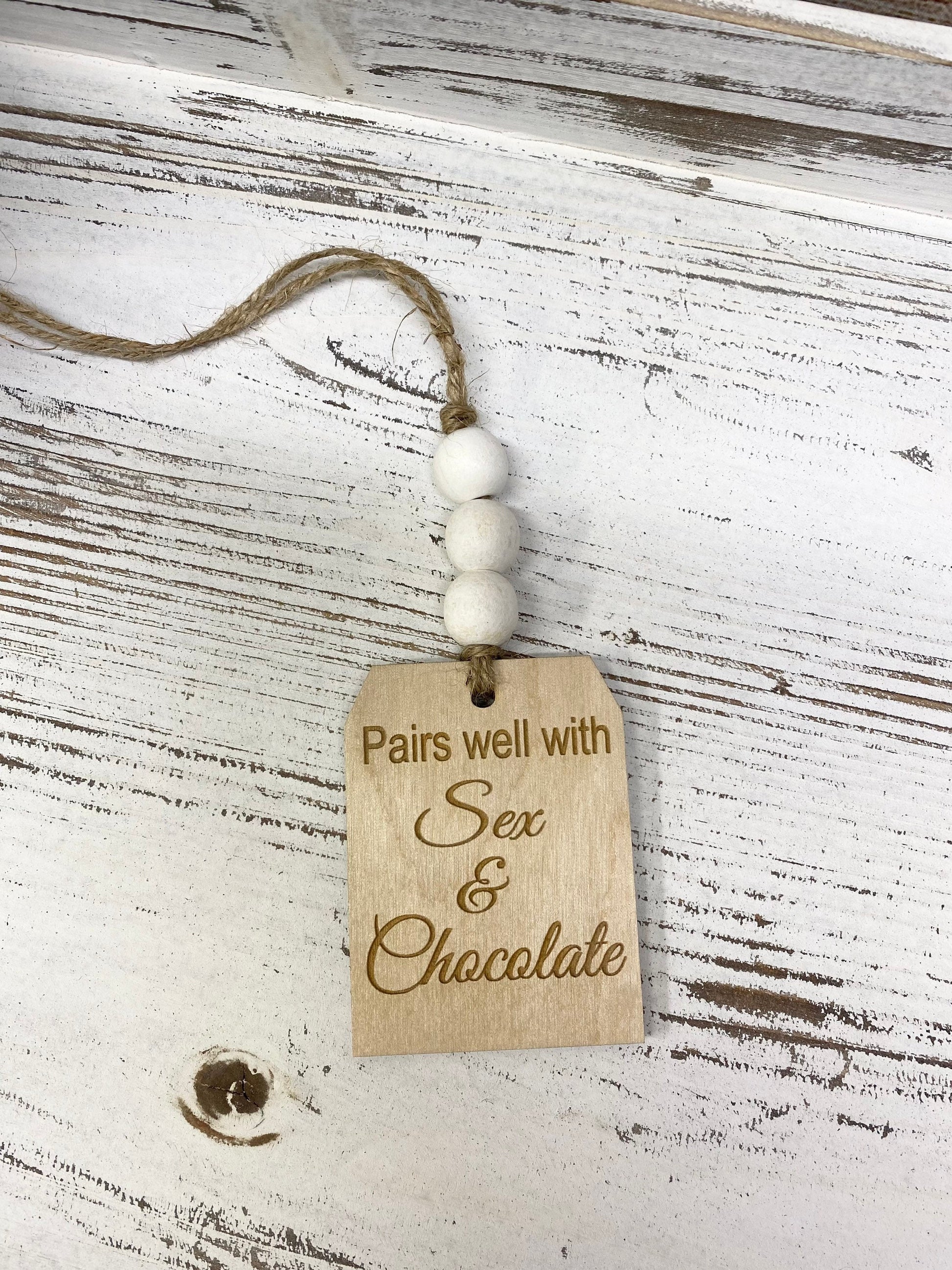 Elevate your wine gifting with our "Pairs Well with Sex and Chocolate" Wine Bottle Tags. Perfect for adding a playful, personalized touch to your favorite bottle, these tags are meticulously cut and engraved using our precision laser. Measuring 3" H x 2.25" W (excluding the jute string and red bead), each tag is crafted from 1/4" wood for a natural, rustic charm.