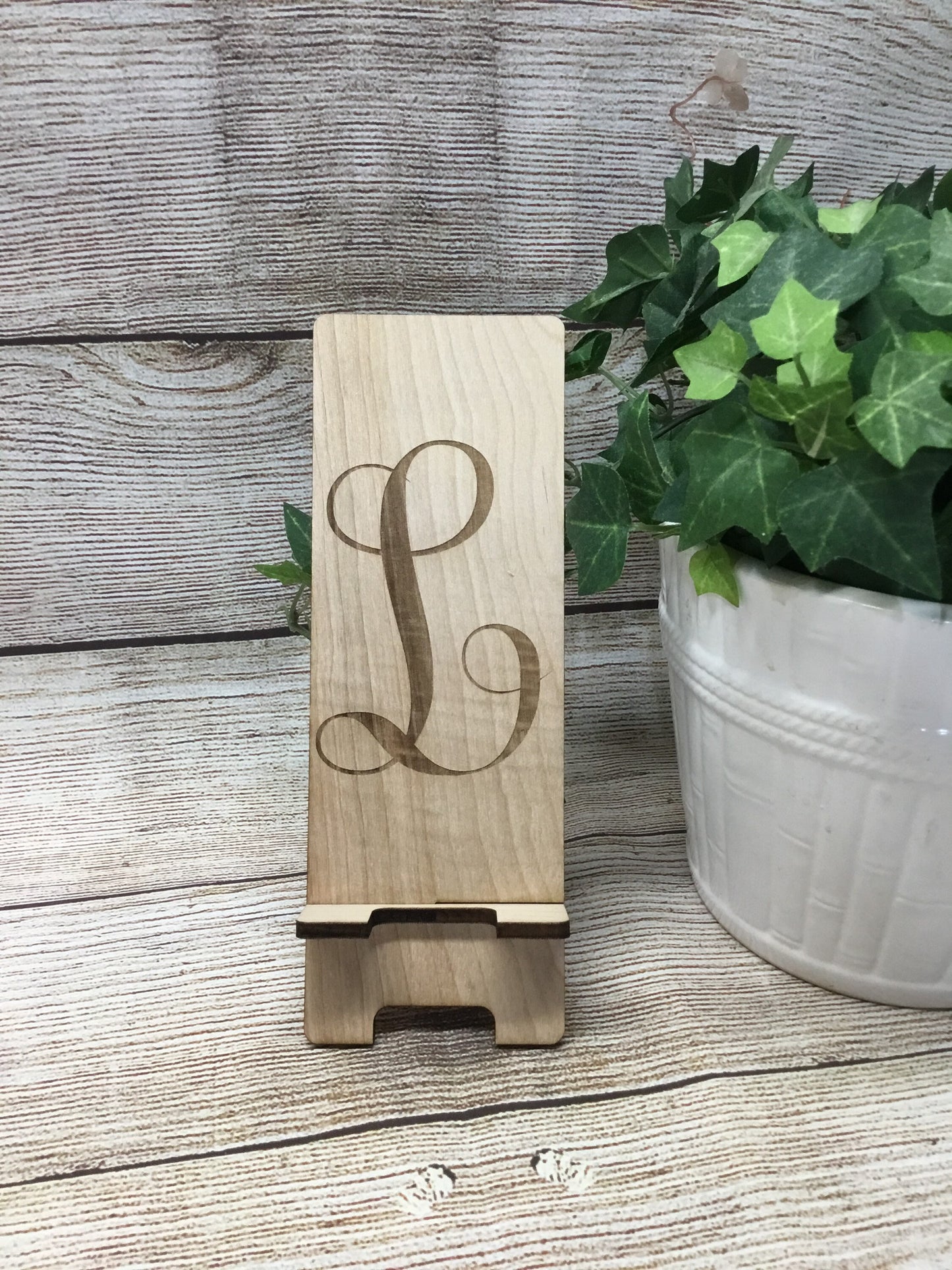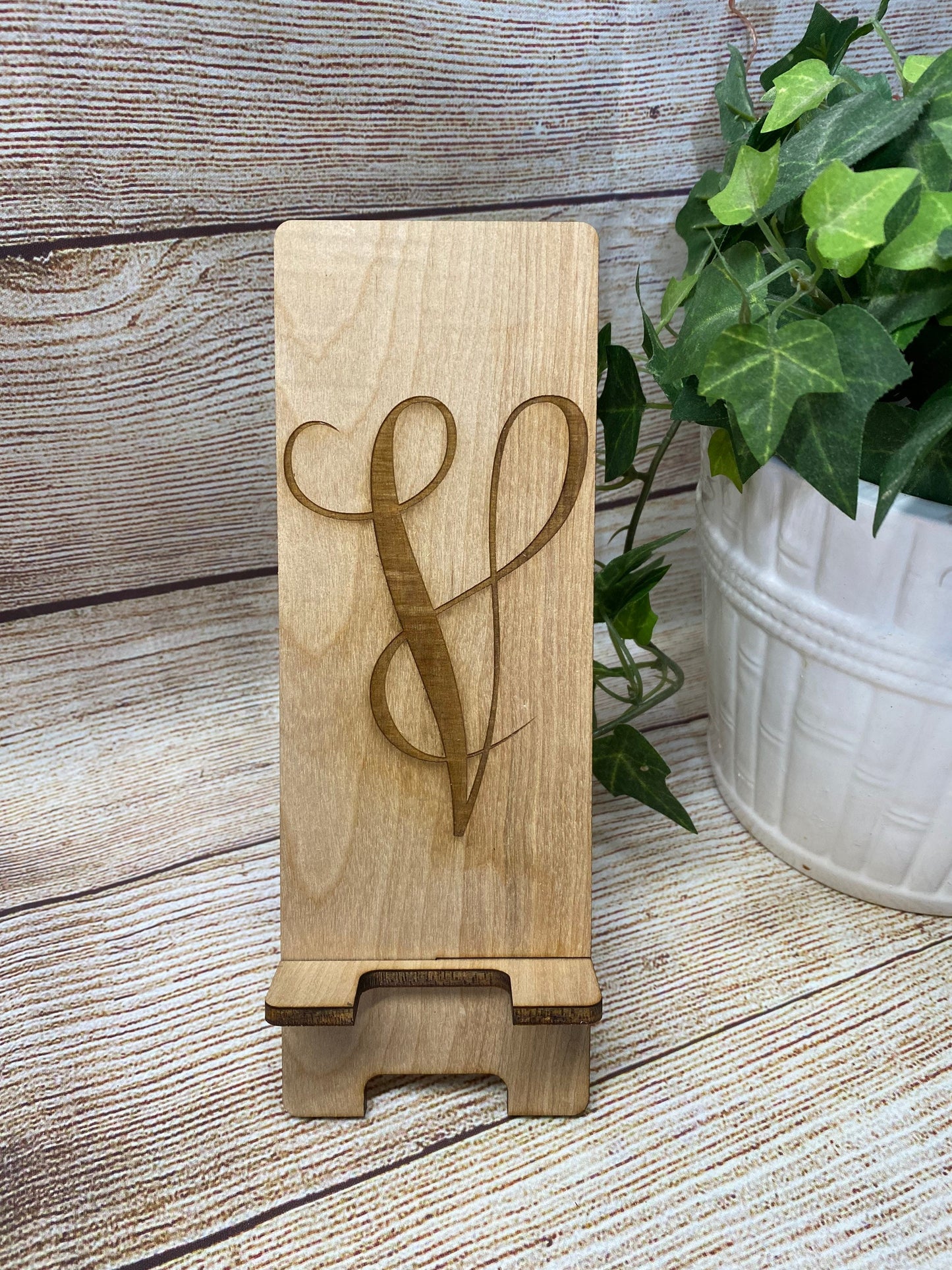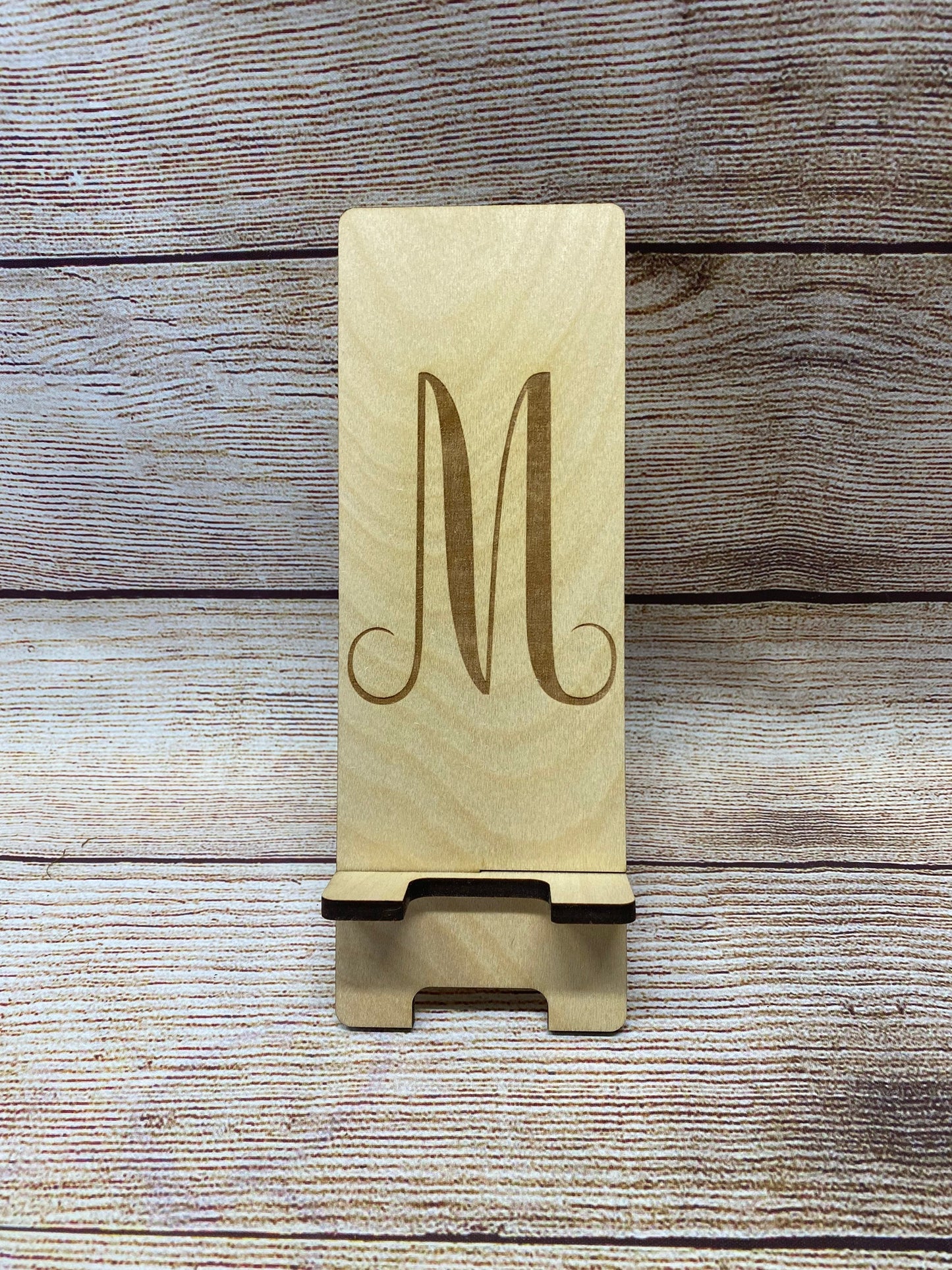Our laser cut and engraved wood cell phone stands are made with 1/4” birch. Each one is made right here at our small shop. Each piece of wood will look different as no two pieces are exactly the same. Choose your initial during purchase and I’ll take care of the rest. Measurements: Overall Height - 7.5" Phone Resting Area - 6.75" Wood Thickness - .25" These make the perfect gift for anyone, including the hard to buy for office staff. Buy them the gift that they will use day after day. *Each piece of wood is different. Variations are to be expected.* Please reach out with any questions or custom orders.