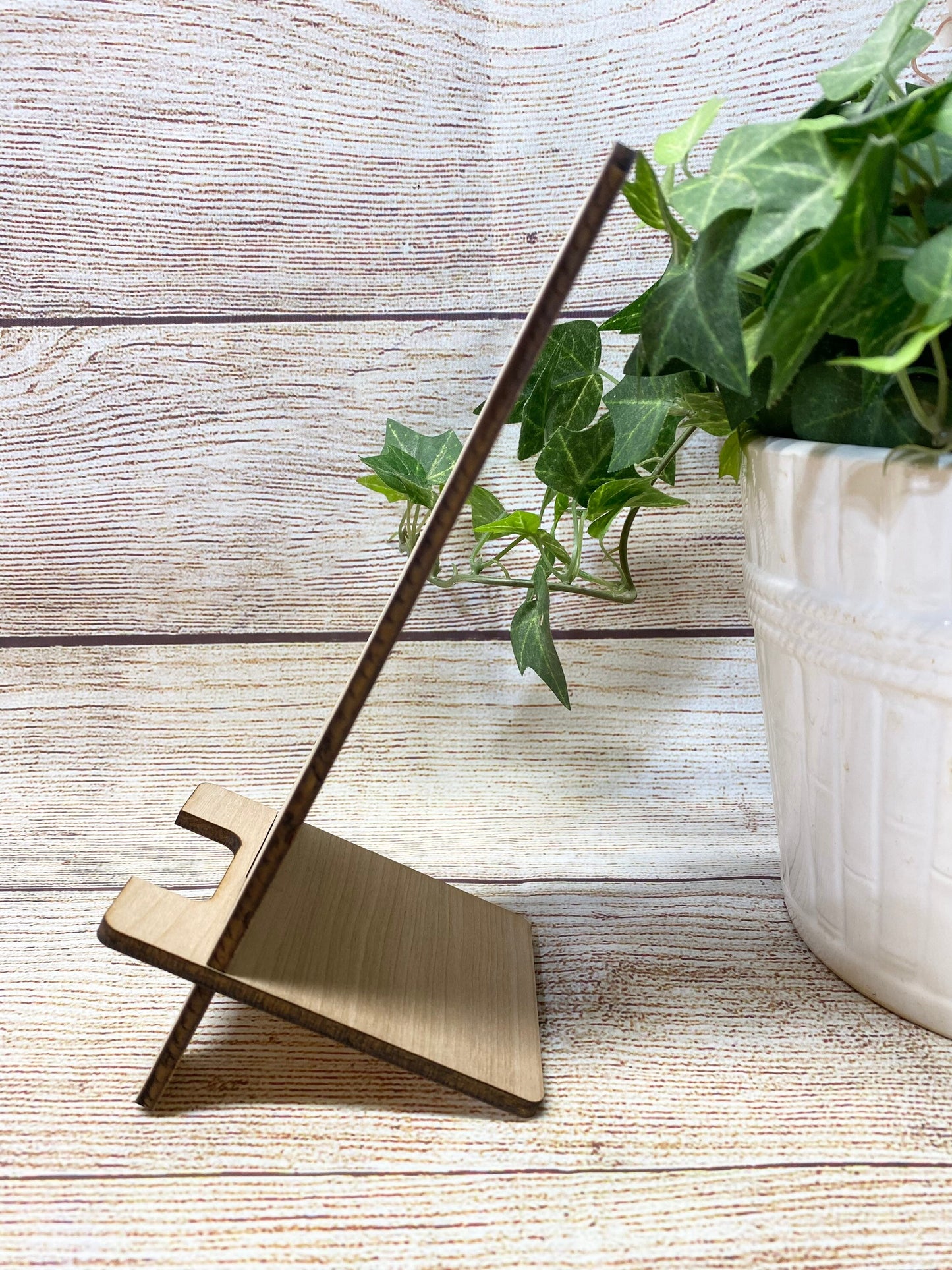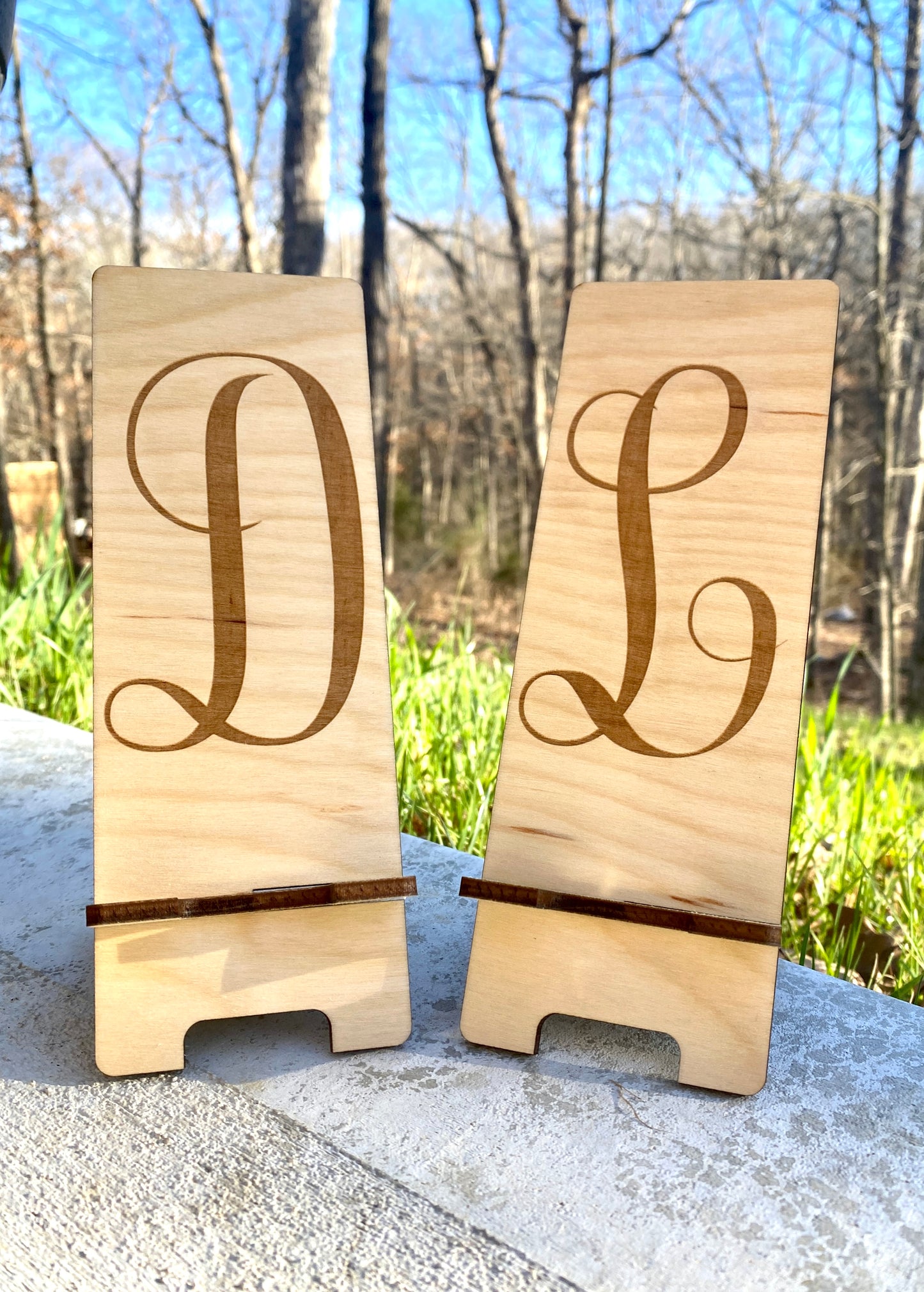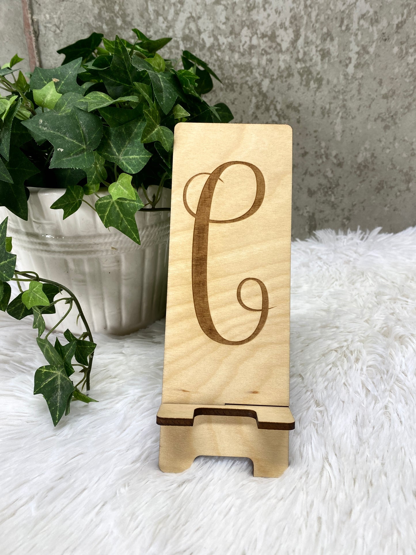 Our laser cut and engraved wood cell phone stands are made with 1/4” birch. Each one is made right here at our small shop. Each piece of wood will look different as no two pieces are exactly the same. Choose your initial during purchase and I’ll take care of the rest. Measurements: Overall Height - 7.5" Phone Resting Area - 6.75" Wood Thickness - .25" These make the perfect gift for anyone, including the hard to buy for office staff. Buy them the gift that they will use day after day. *Each piece of wood is different. Variations are to be expected.* Please reach out with any questions or custom orders.