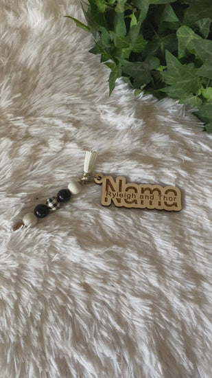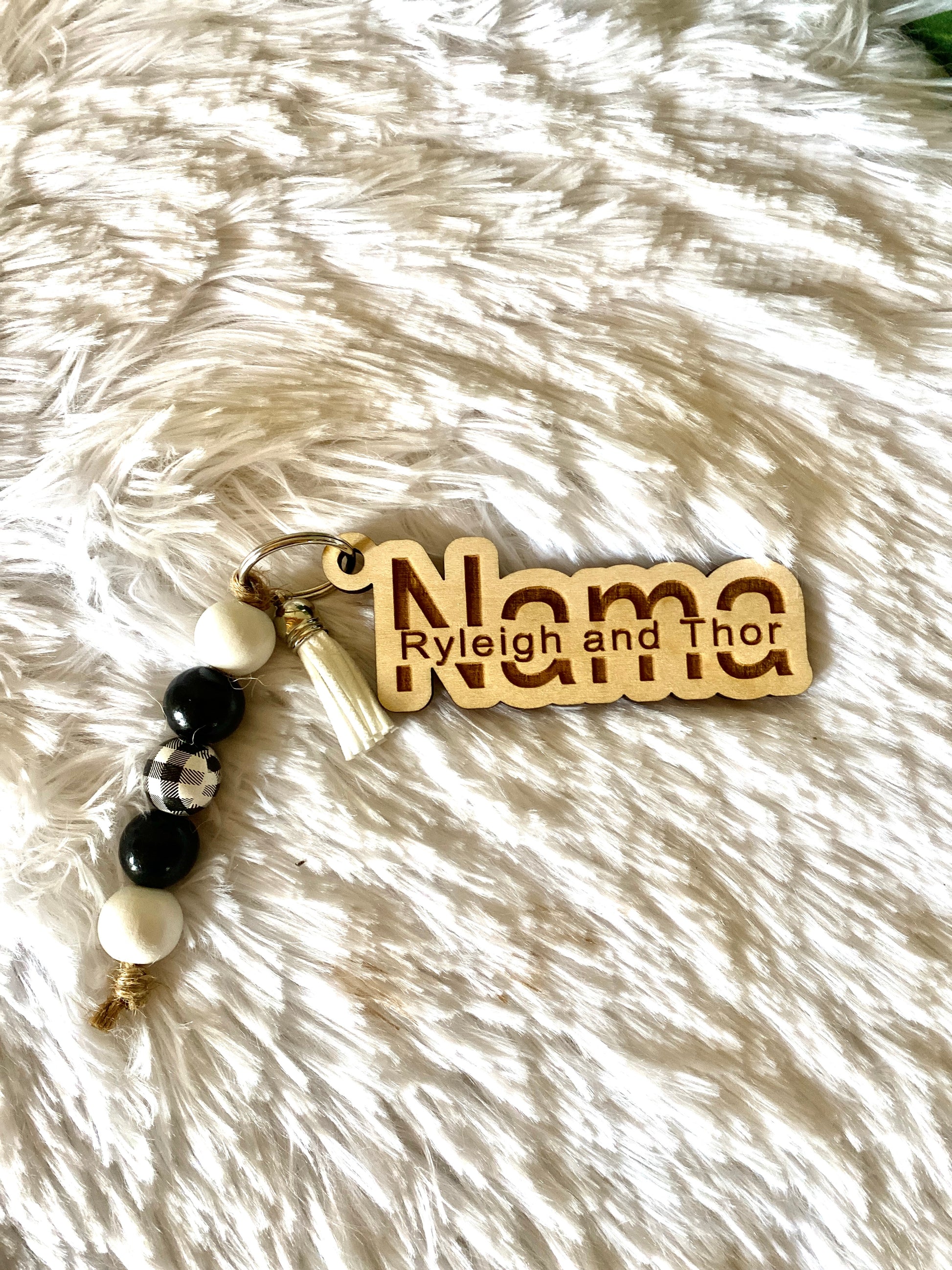 Our Nama keychains are engraved and cut on 1/4" wood with grandkids names. We add a keyring, white tassel, string with black and white beads. The overall length from end to end is approximately 9" (spread out). The length from a hanging position is about 4.5". We can add up to 4 names per keychain. The longer the names, the smaller the lettering will be to fit in the space provided. These make great gift for Nama (Grandma) for Mother's Day or Grandparent's Day. Please do not hesitate to reach out with any questions you may have. Happy to help!