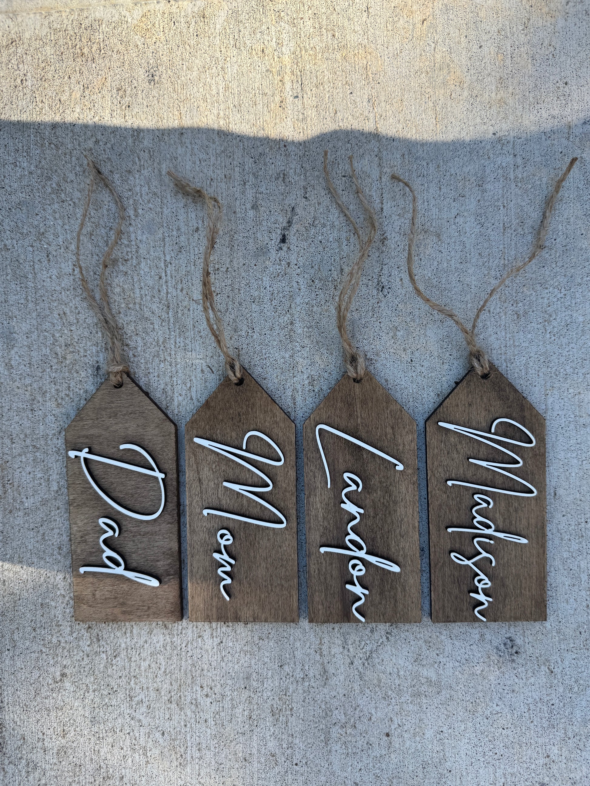 Add a rustic, elegant touch to your holiday decor with our custom wooden stocking tags. Each tag is crafted from high-quality wood, stained in a rich dark walnut finish, and adorned with white lettering for a classic, festive look. Measuring 5.25" tall by 2.25" wide (excluding the included jute string), these tags are the perfect size to complement your stockings.