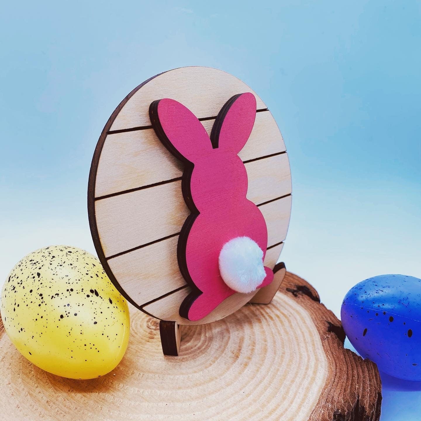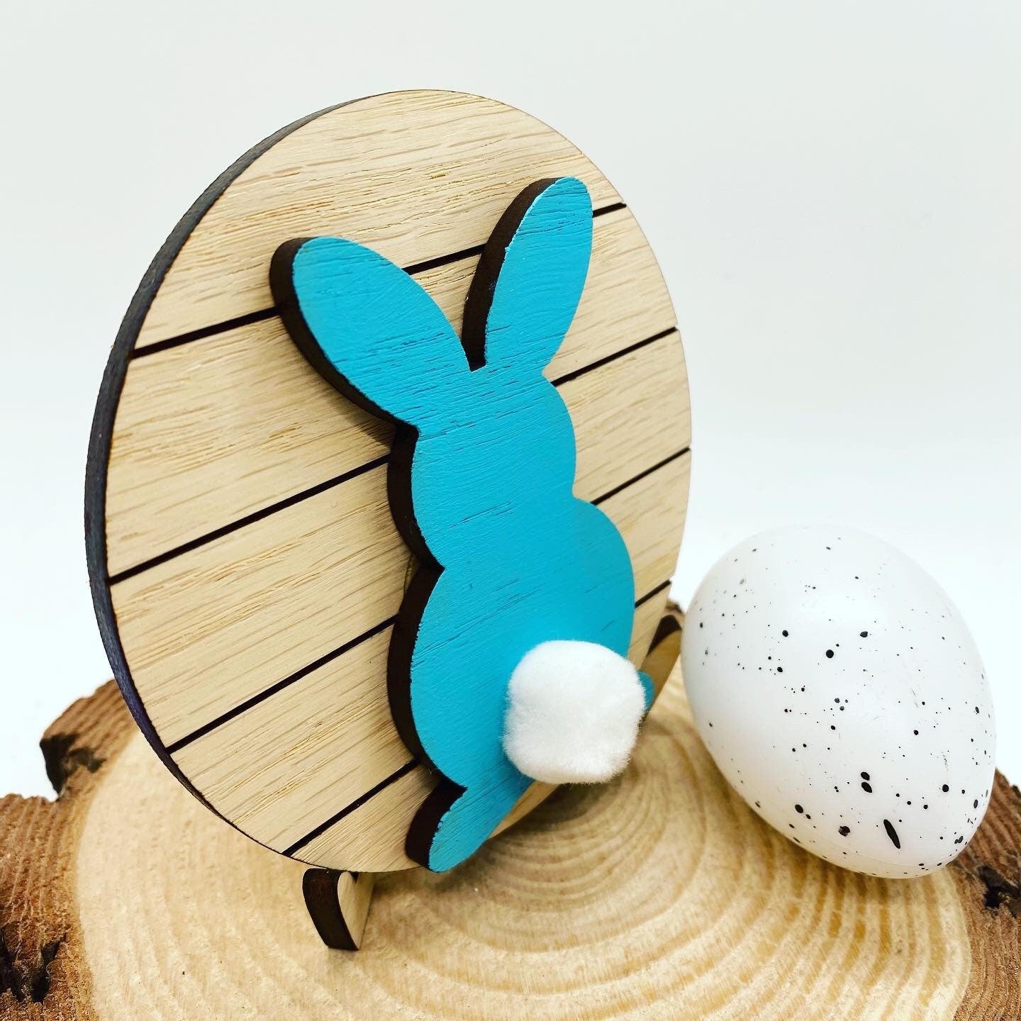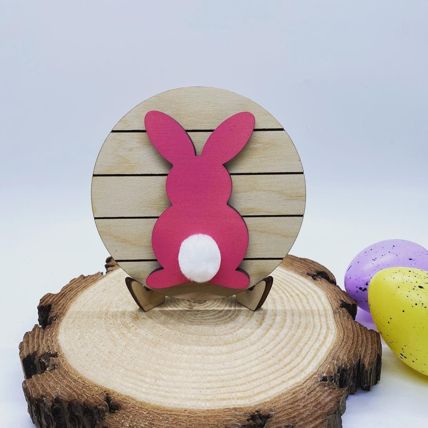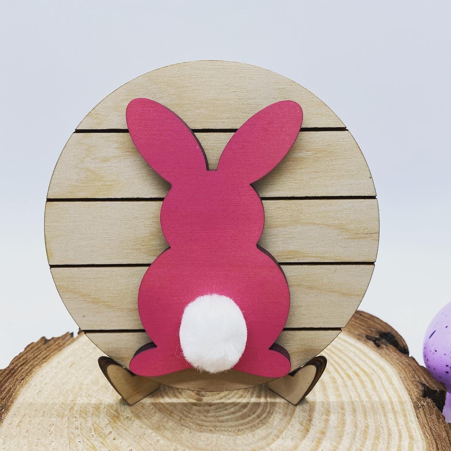 These tiered tray signs measure approximately 4” in diameter. The round has engraved lines to resemble a ship lap look. The bunny is painted on top leaving the sides with the laser cut edge and glued to the round. The bunny also has a white glued tail Each piece is laser cut and design painted by me! These add the perfect touch to your holiday tiered tray or kitchen decor. Choose to include our laser cut easel at checkout. If the easel is not chosen the round will need to lean as it’s not free standing. Each piece of wood is unique and no two will be exactly the same. Please don’t hesitate to reach out with any questions! *listing is for the sign and easel if chosen. Other props shown in pictures are not included*