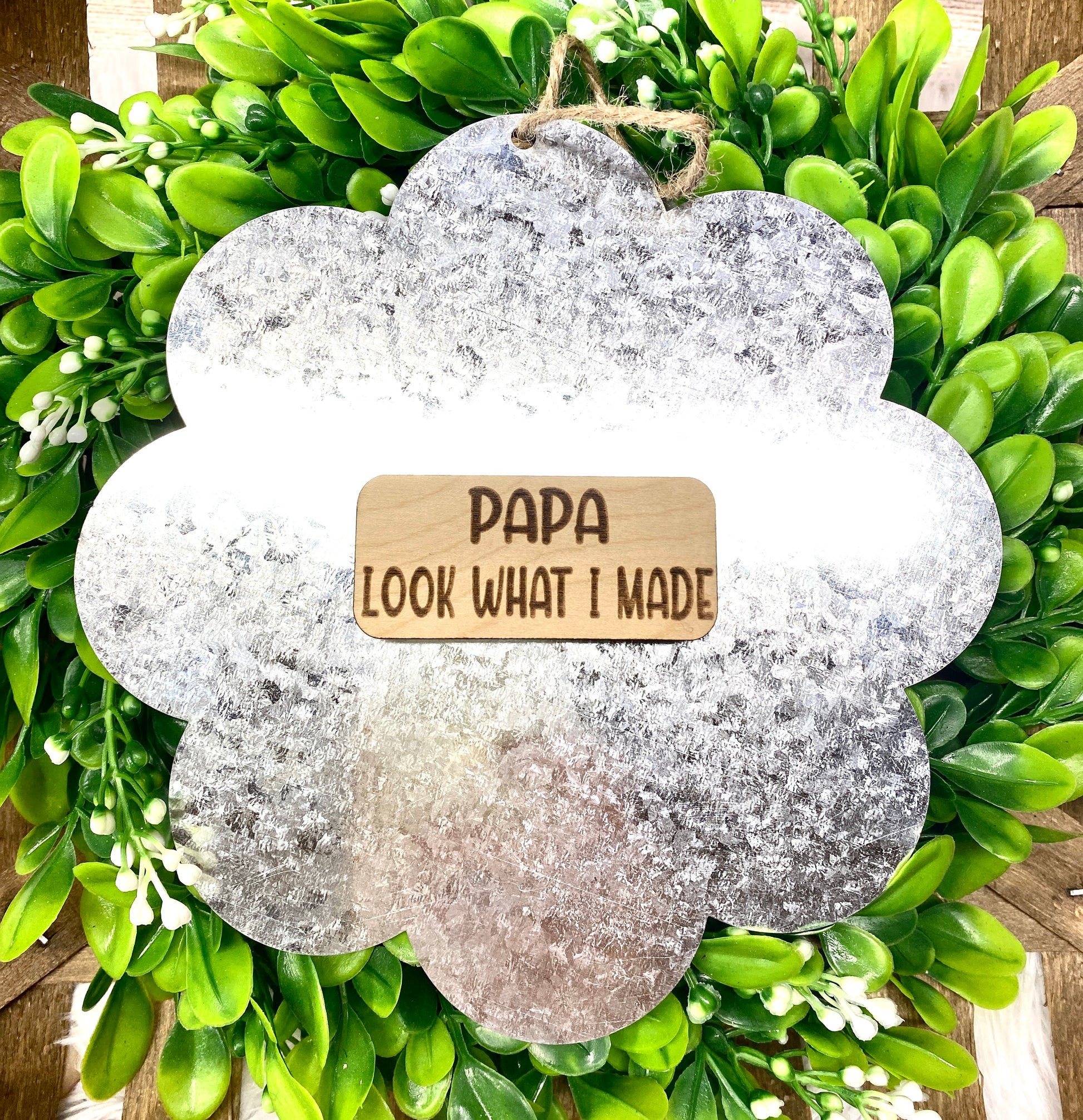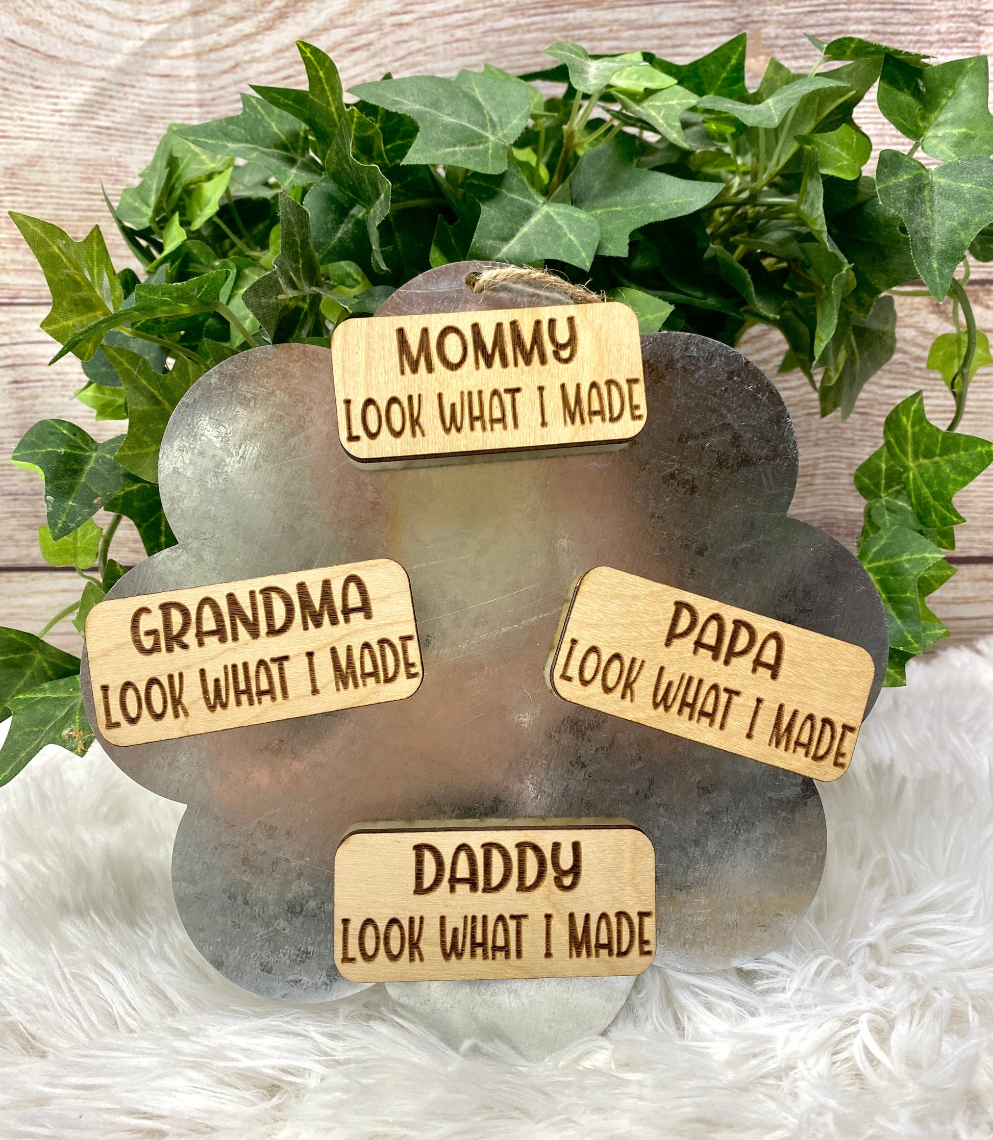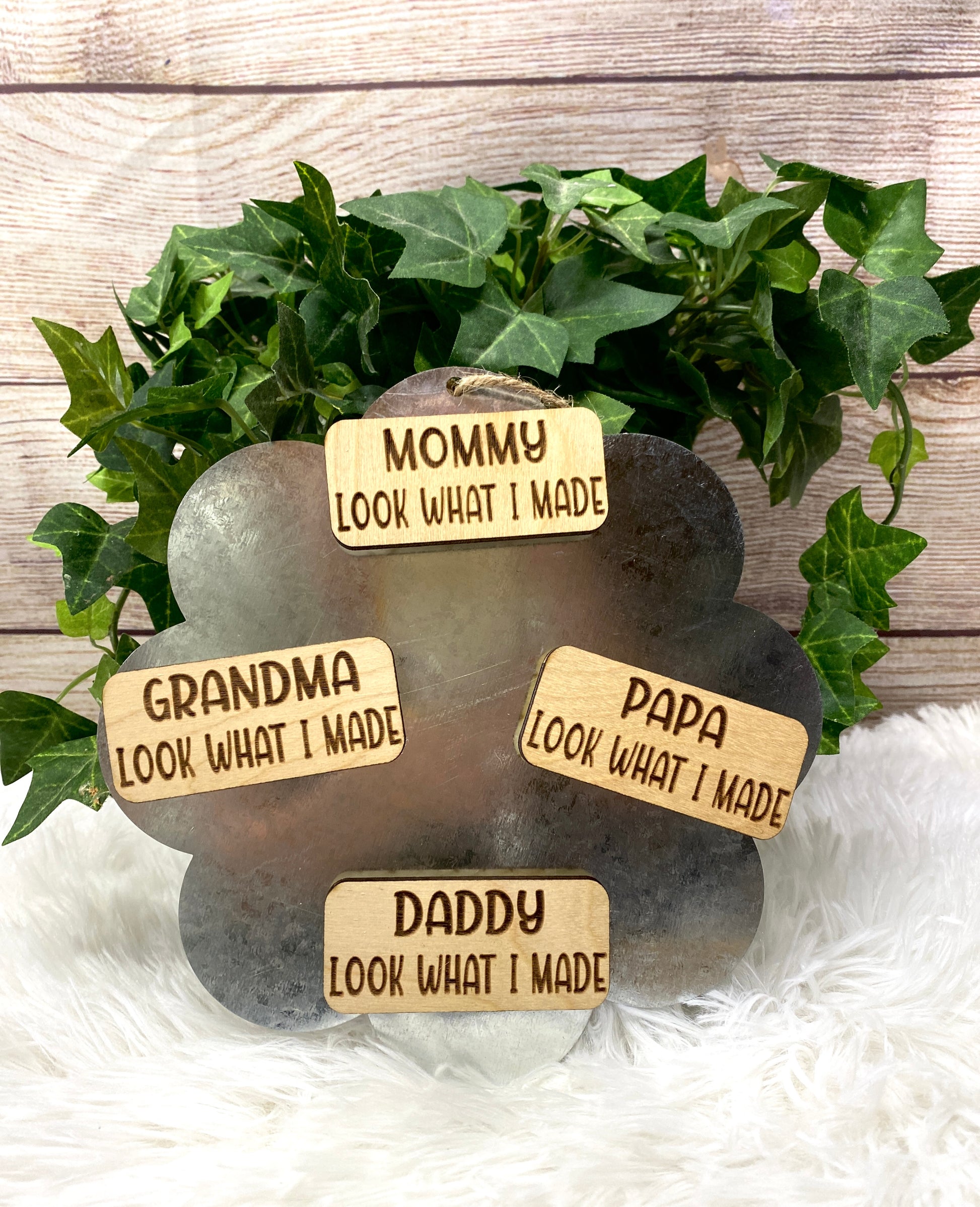 Let your child’s creativity shine with this refrigerator magnet: Look What I Made! Crafted from wood, laser-engraved and cut. Choose from Mommy, Daddy, Papa, Nana, Gigi, Maw maw and Grandma shapes. Great for displaying your family’s artwork with pride and joy. Show off and celebrate your little one's talent?