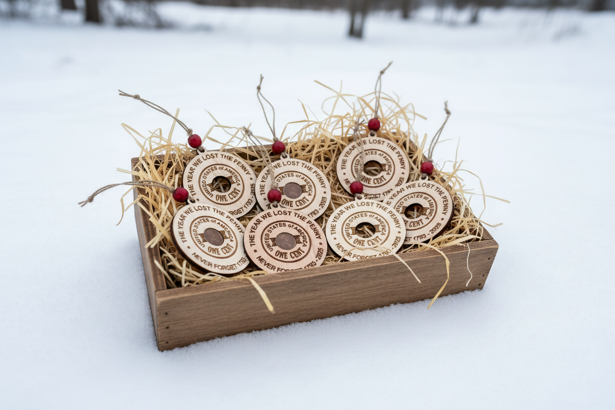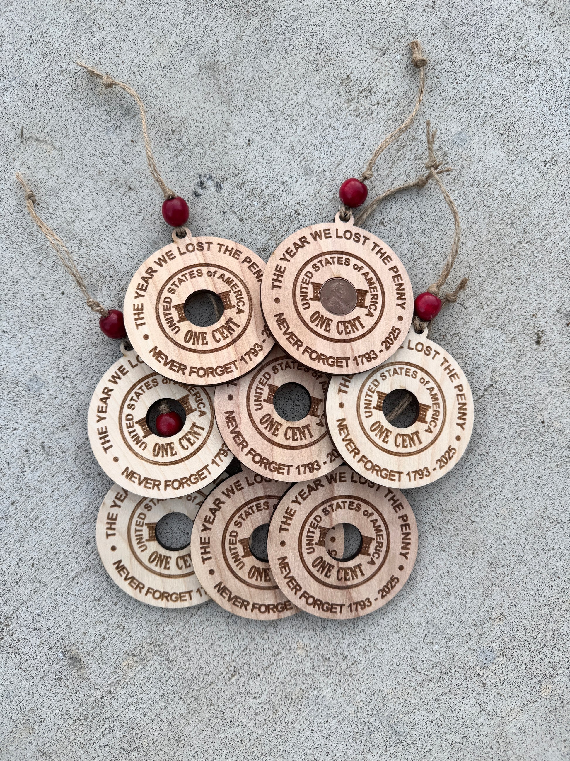 Mark the end of an era with this commemorative penny ornament, honoring the retirement of the U.S. one-cent coin in 2025. Thoughtfully laser cut and engraved on natural wood, this ornament features a detailed penny design and the inscription “The Year We Lost the Penny – Never Forget 1793–2025,” celebrating over two centuries of American history.
