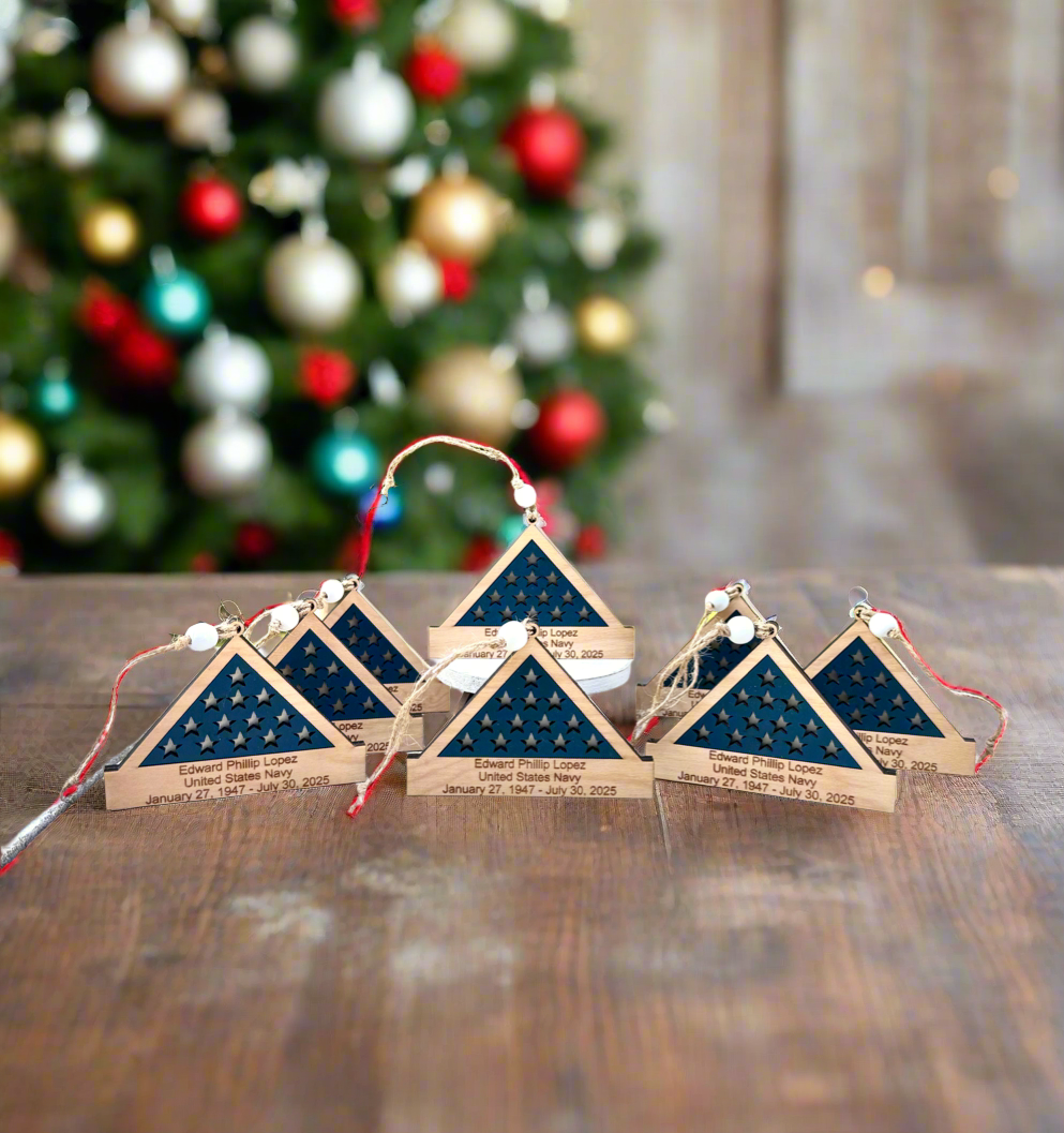 Honor the legacy and sacrifice of your loved one with our Wood Personalized Folded Flag Veteran Memorial Ornament. This beautifully crafted piece serves as a heartfelt tribute, encapsulating the pride and reverence for those who have served our country.